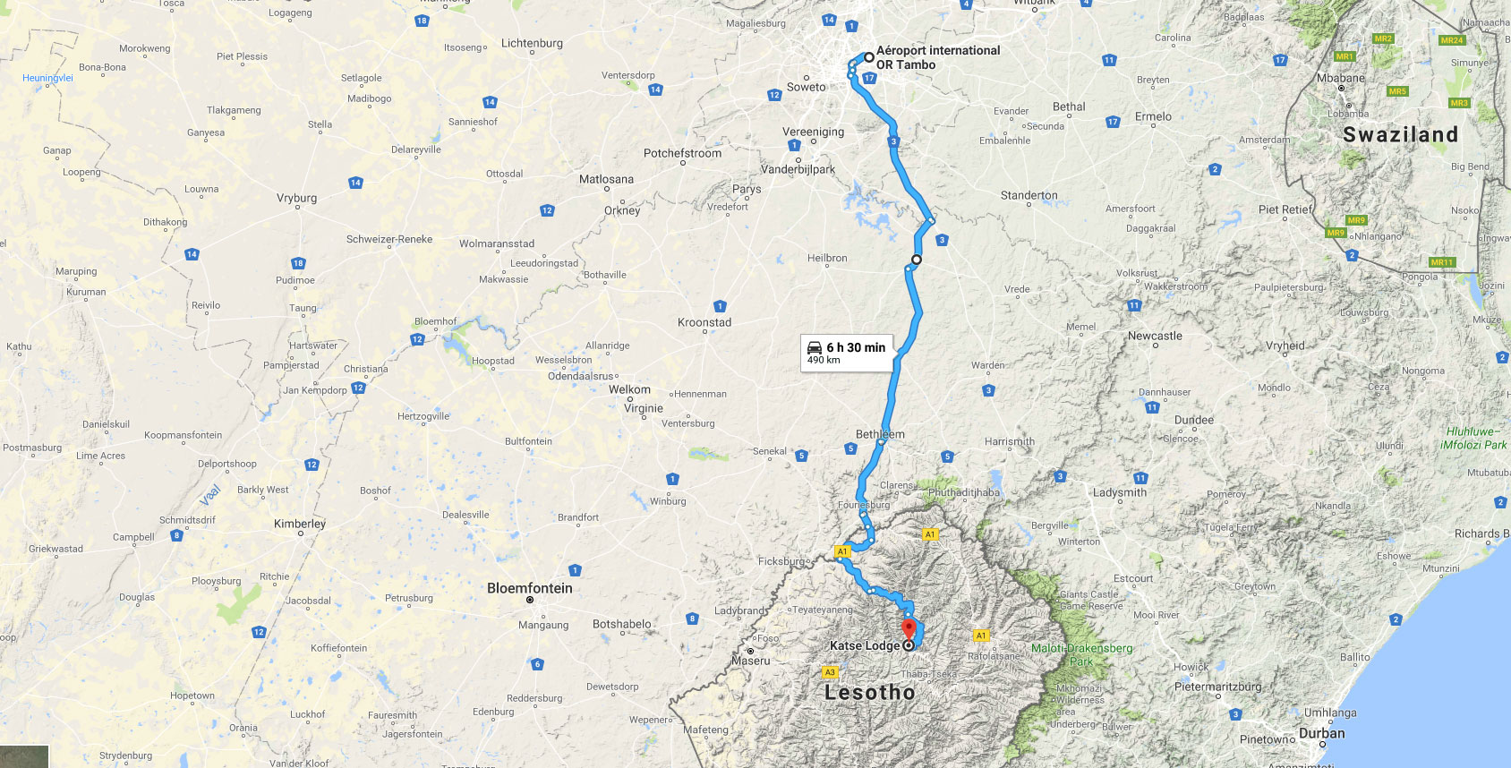 Tout cela nous emmène bien tard et nous ne prenons la route qu’en fin d’après-midi. Mauvaise surprise, l’éclairage du Toy est catastrophique. Dès que la nuit tombe, on n’y voit plus rien. C’est dommage, de nombreux piétons marchent au bord ou sur la route et la conduite nocturne n’est pas rassurante dans cette angoisse de renverser un promeneur nocturne. Nous ferons donc rapidement étape dans un B&B à Frankfort, pour reprendre la route le lendemain matin en direction du Lesotho et du lac de Katse.