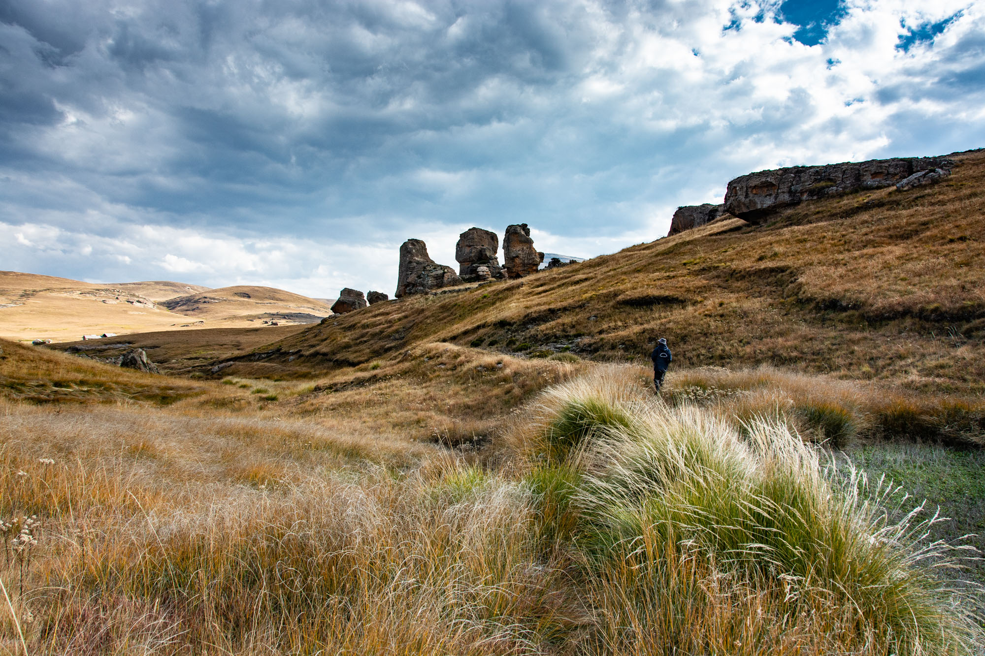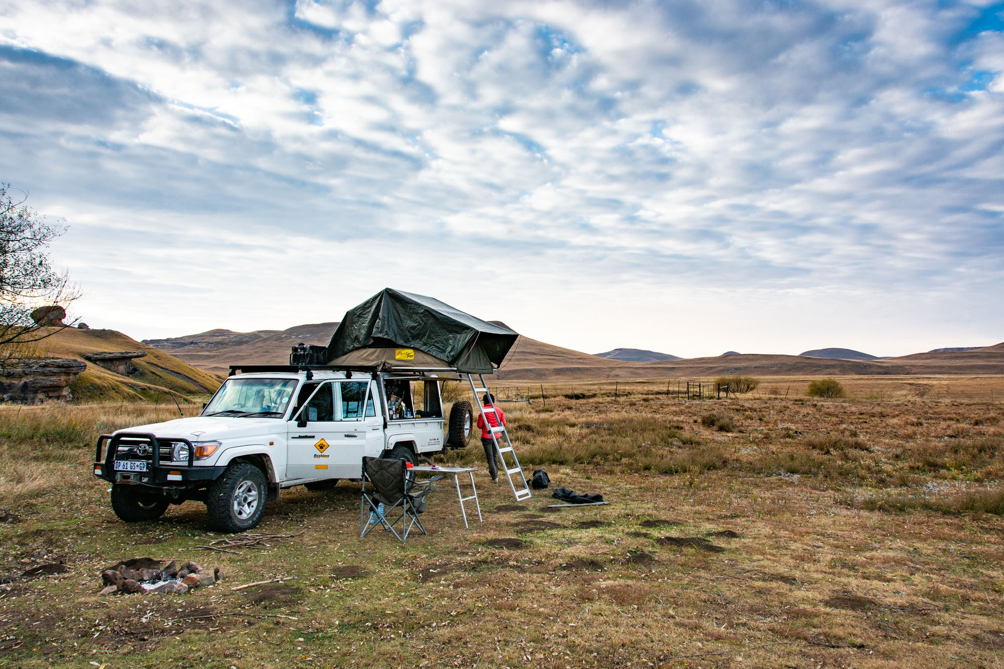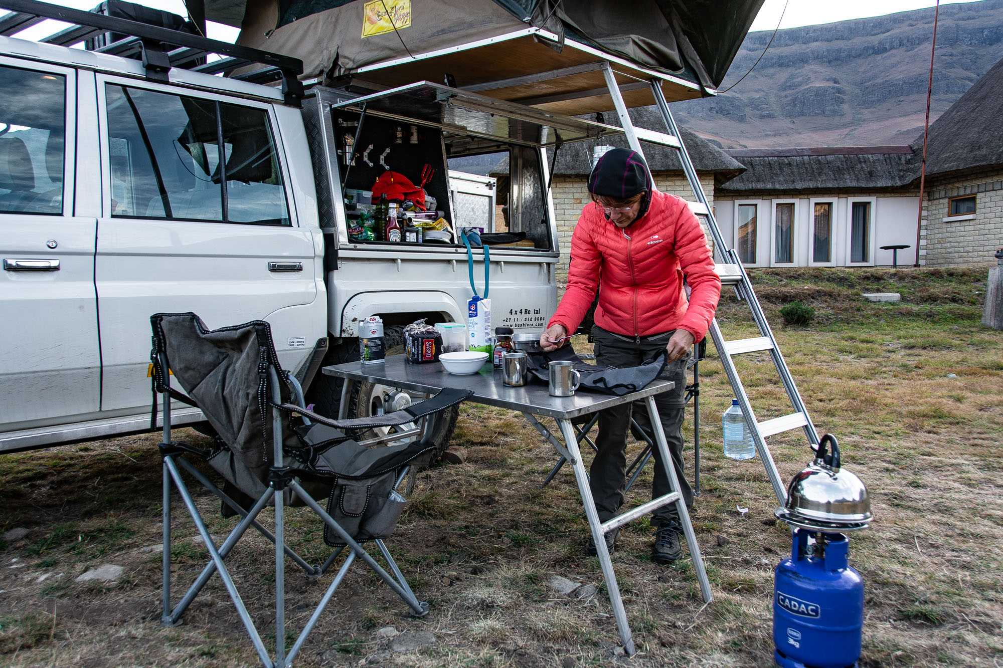 Le soir venu, nous nous installons, seuls, sur le terrain de camping, à proximité de l’ancien lodge. Un groupe de militaires occupe un baraquement à quelques centaines de mètres de là. Ils ne nous dérangerons pas, bien que l’un d’entre eux nous fasse une visite, à la recherche de son revolver qu’il aurait perdu dans le coin… Un de ses collègues vient rapidement le rappeler à l’ordre ! Le paysage autour du camping est extraordinaire, mélange de prairies, de collines et de formations rocheuses. L’ennui, c’est qu’on est à 2200 mètres d’altitude et que le froid tombe vite. Nous nous réchaufferons autour du feu avant d’aller nous blottir au fond de nos sacs de couchage.