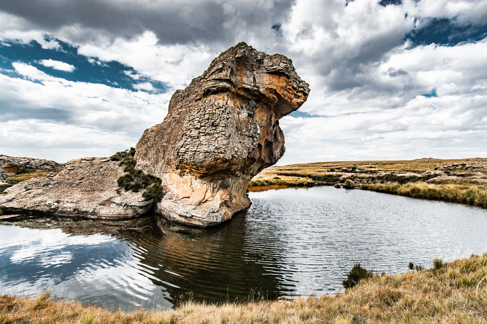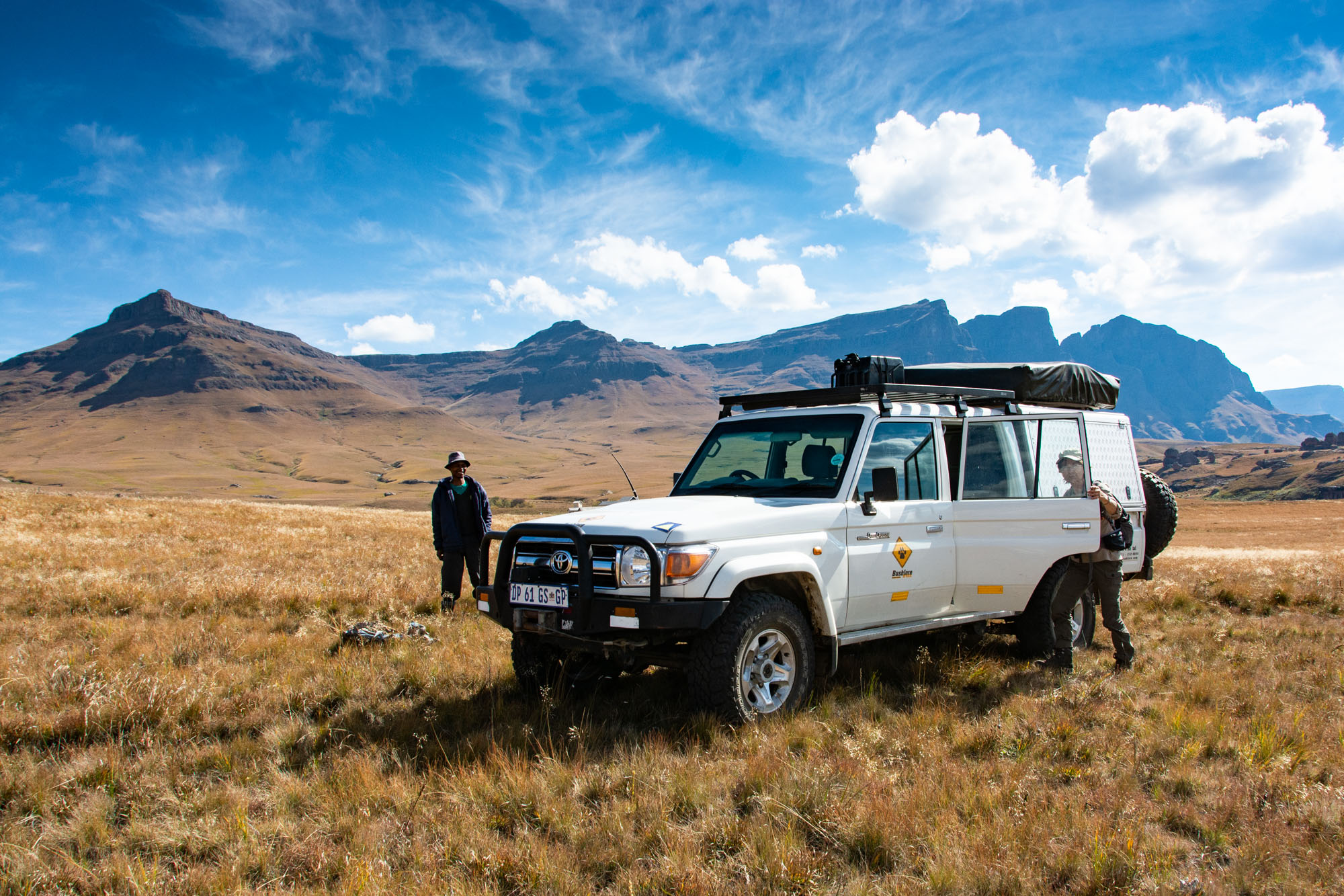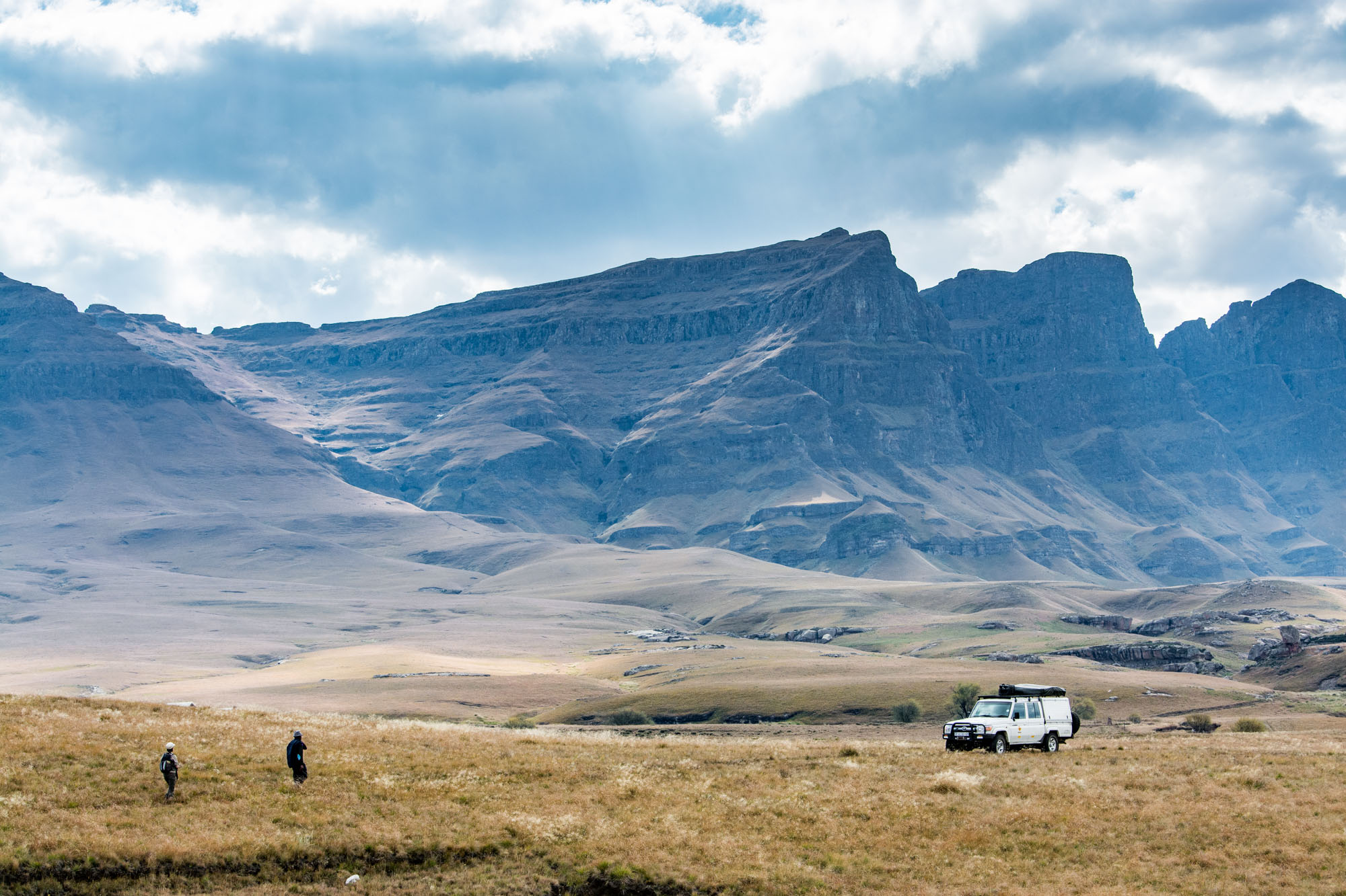 Le soir venu, nous nous installons, seuls, sur le terrain de camping, à proximité de l’ancien lodge. Un groupe de militaires occupe un baraquement à quelques centaines de mètres de là. Ils ne nous dérangerons pas, bien que l’un d’entre eux nous fasse une visite, à la recherche de son revolver qu’il aurait perdu dans le coin… Un de ses collègues vient rapidement le rappeler à l’ordre ! Le paysage autour du camping est extraordinaire, mélange de prairies, de collines et de formations rocheuses. L’ennui, c’est qu’on est à 2200 mètres d’altitude et que le froid tombe vite. Nous nous réchaufferons autour du feu avant d’aller nous blottir au fond de nos sacs de couchage.