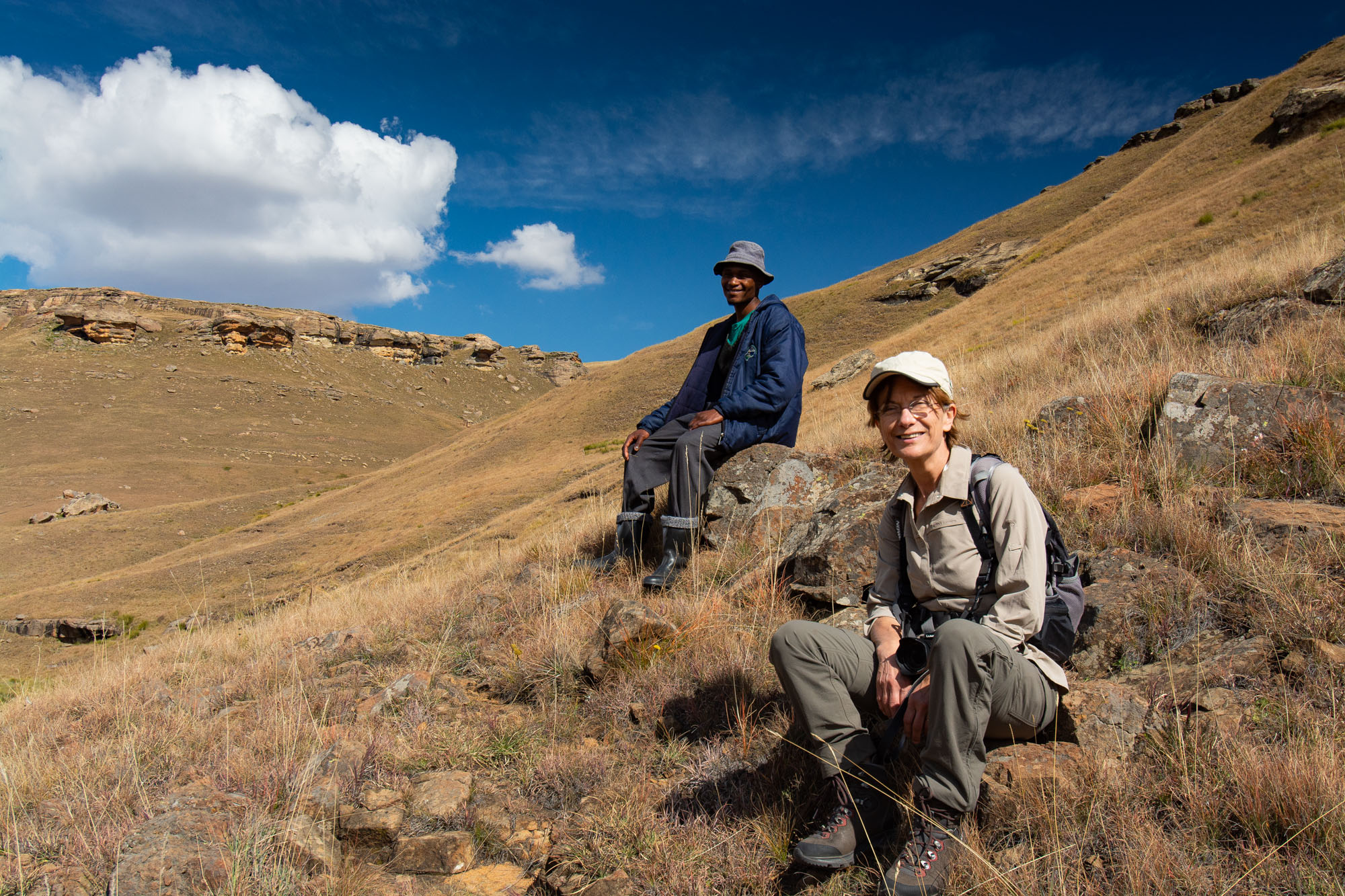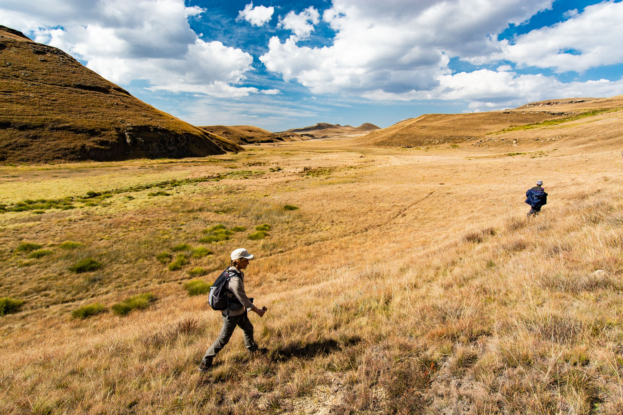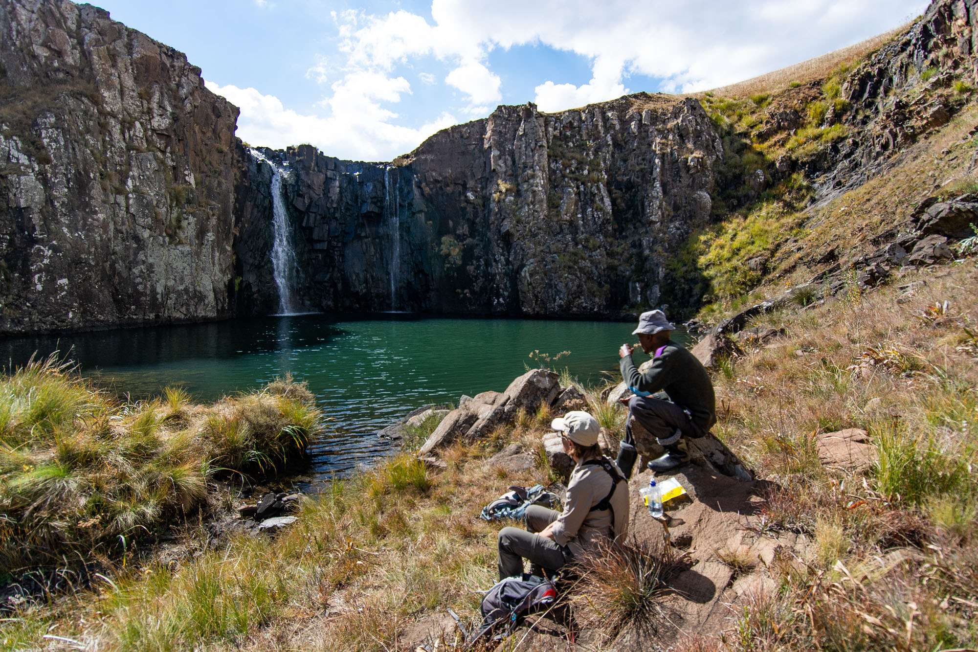 Au-delà de l’ancien lodge, la piste n’est plus qu’une trace que nous suivons encore en 4×4 pendant quelques centaines de mètres avant d’abandonner le Toyota au milieu de nulle part pour emprunter un vague sentier au long d’une vallée. Le relief est doux. Heureusement, Elliah est là pour nous garder sur la bonne trace et nous arrivons à la cascade au bout de 3 ou 4 kilomètres.