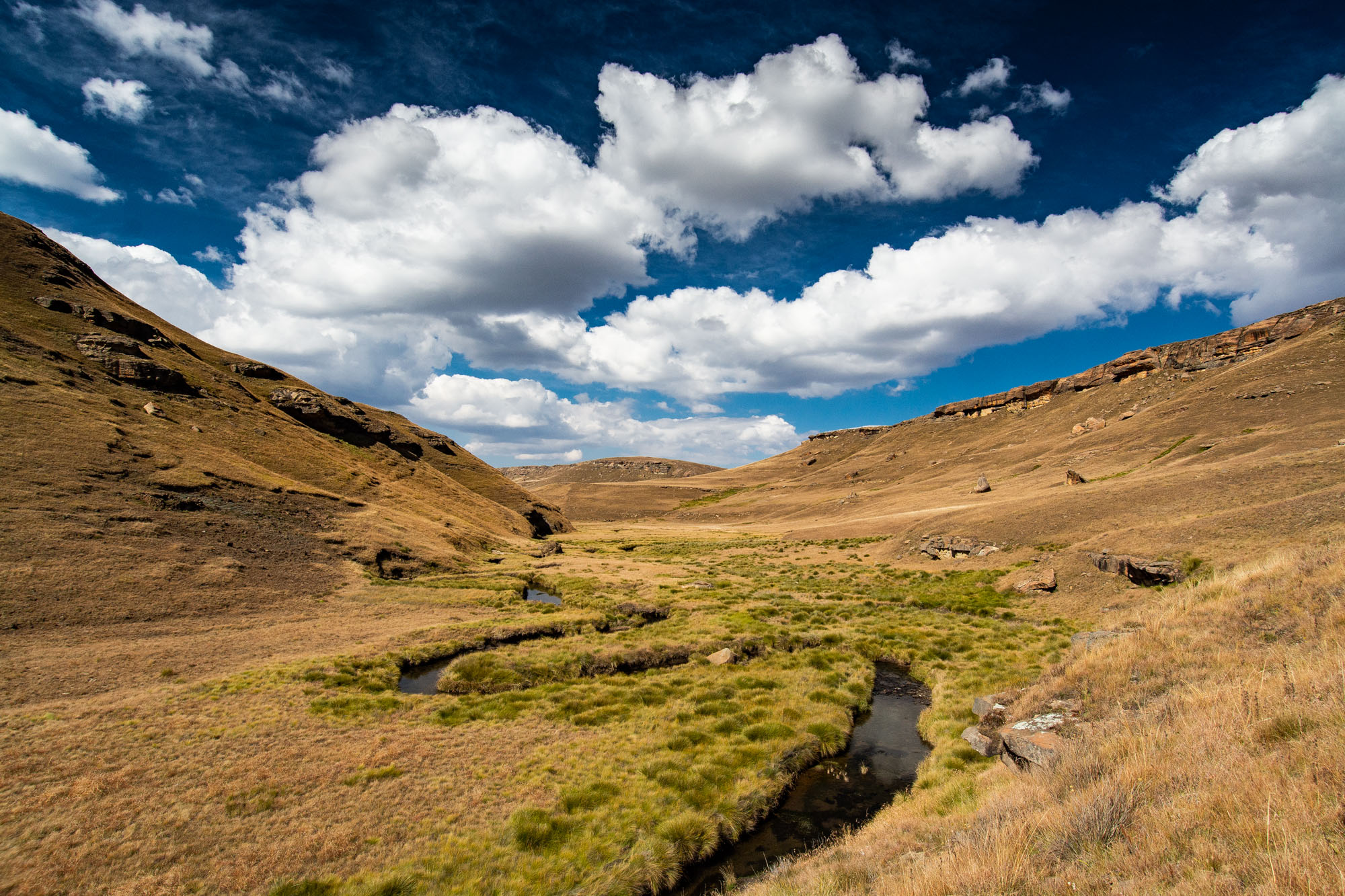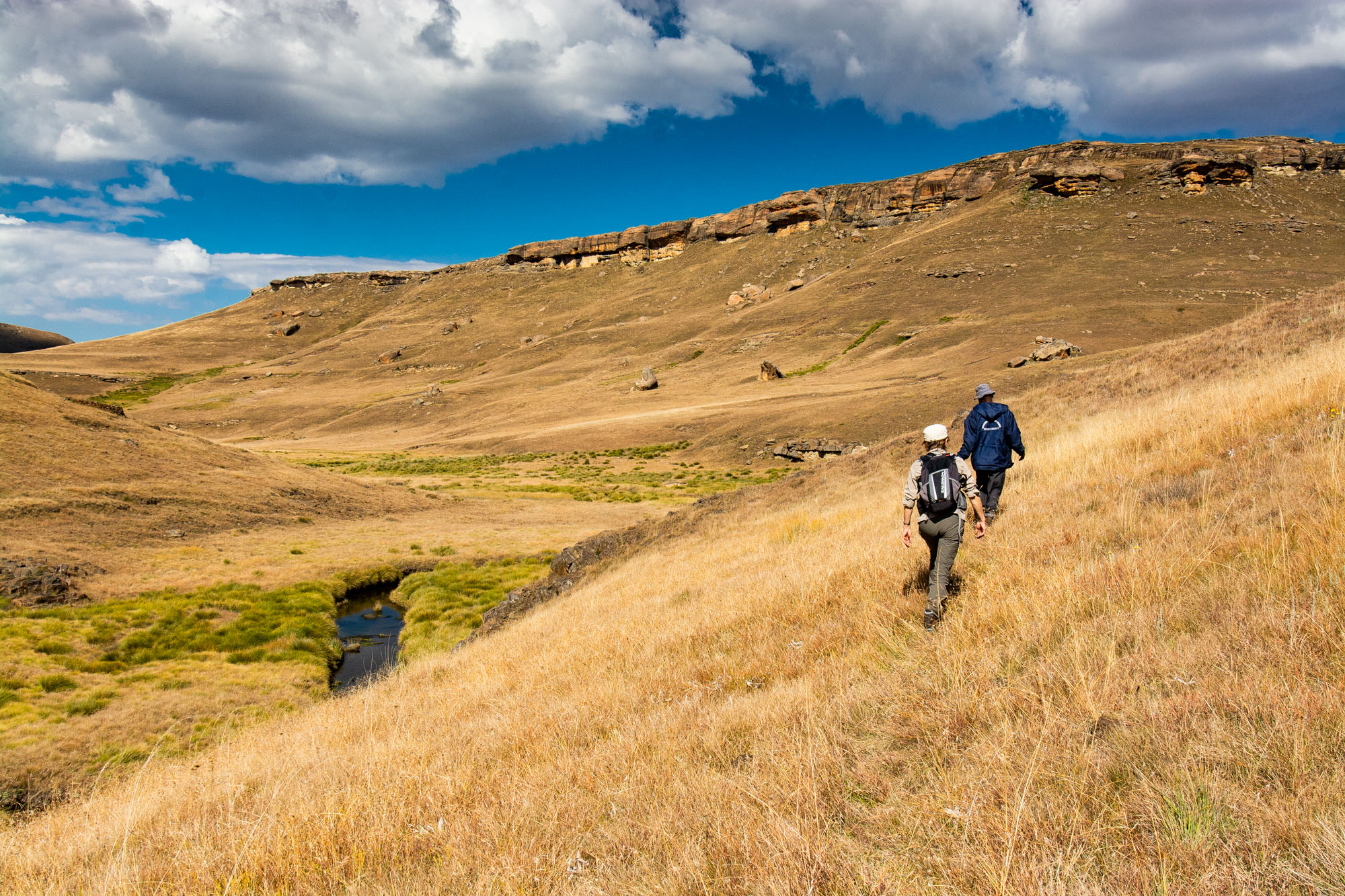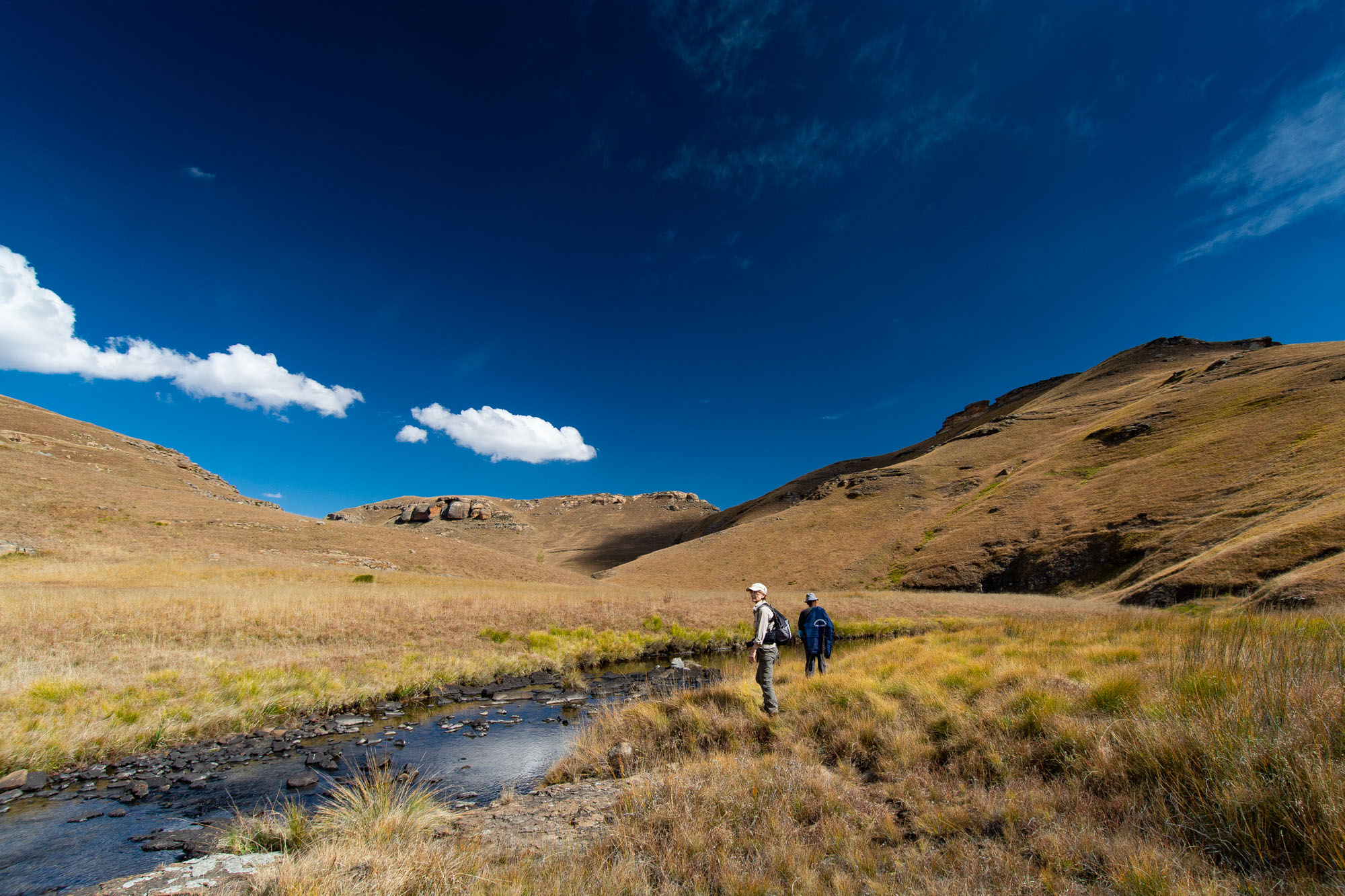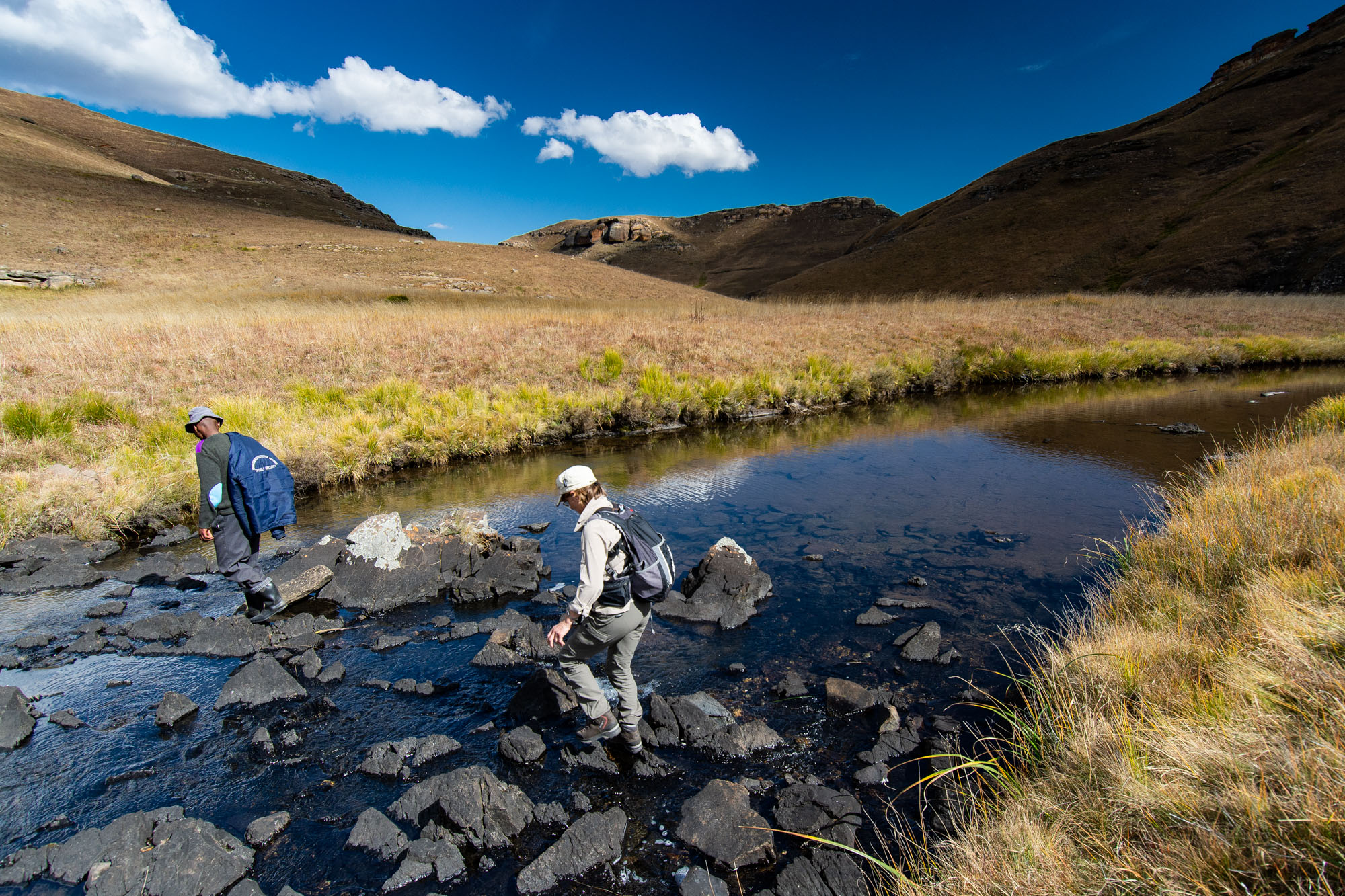 Au-delà de l’ancien lodge, la piste n’est plus qu’une trace que nous suivons encore en 4×4 pendant quelques centaines de mètres avant d’abandonner le Toyota au milieu de nulle part pour emprunter un vague sentier au long d’une vallée. Le relief est doux. Heureusement, Elliah est là pour nous garder sur la bonne trace et nous arrivons à la cascade au bout de 3 ou 4 kilomètres.