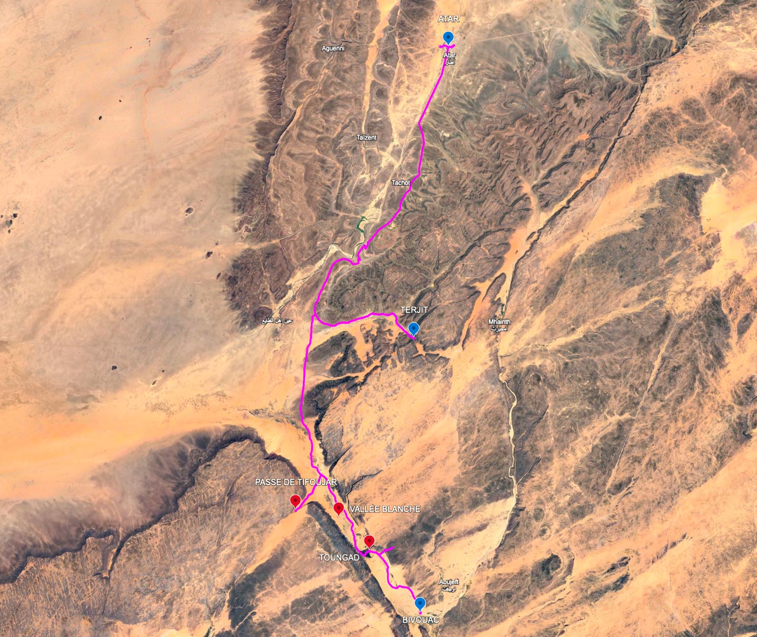 Notre trace, d’Atar au sud de la Vallée Blanche en passant par Terjit, 124 kilomètres