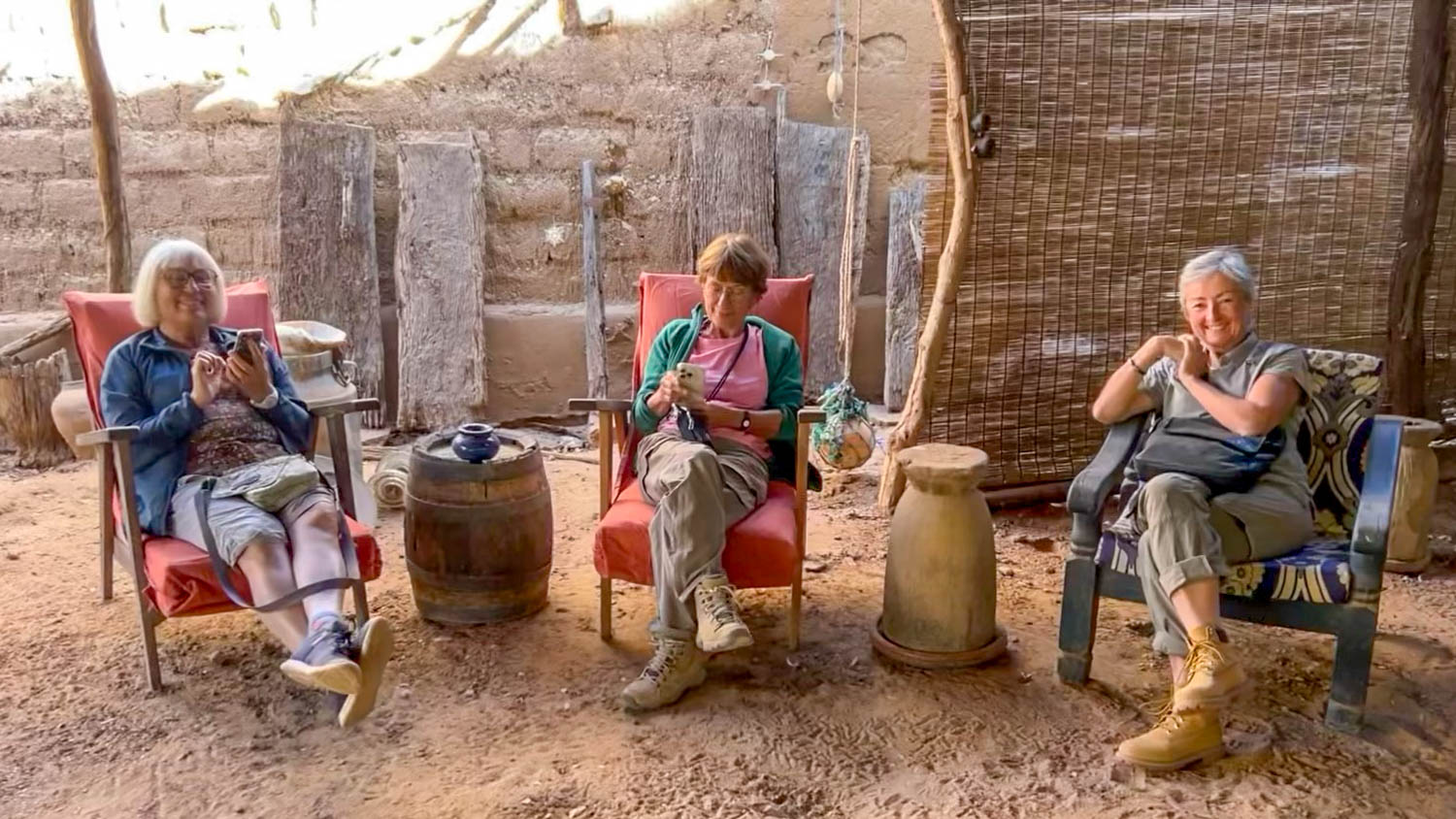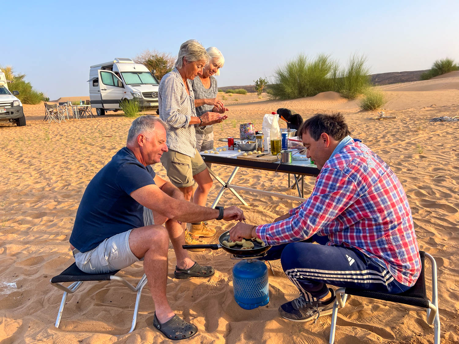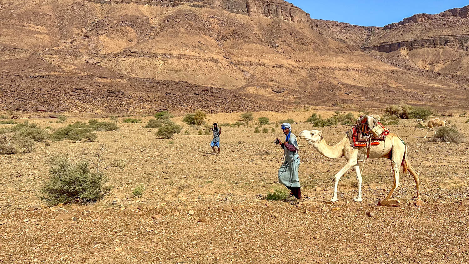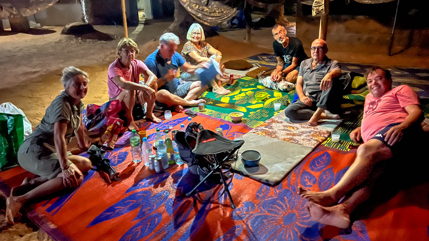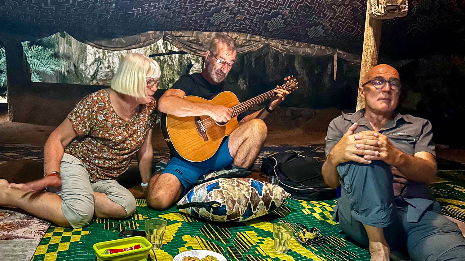 Nous poursuivons le long du petit canyon et la balade nous conduit à un plateau verdoyant. Retour dans la palmeraie par le même chemin, baignade pour certains et le groupe décide de rester y dormir, les uns sous les tentes nomades et nous dans les camions à 5 mn à pied. Nous partageons le dîner sous une jolie tente nomade puis la guitare et les chants résonnent. Une belle parenthèse après ces journées de désert.