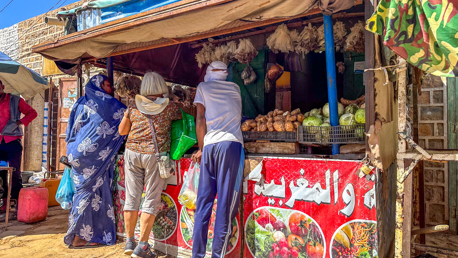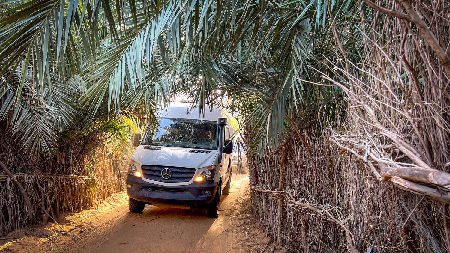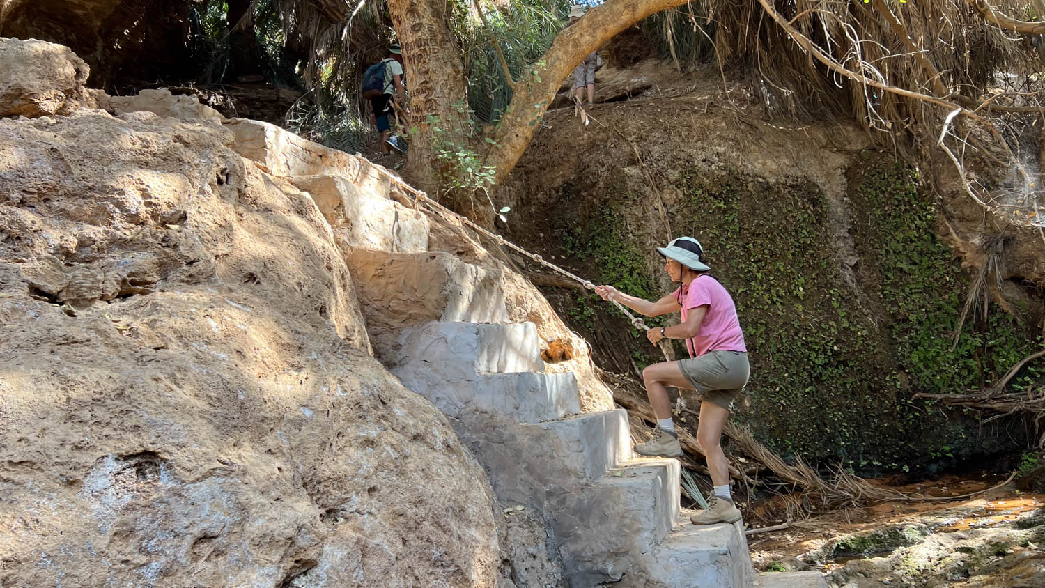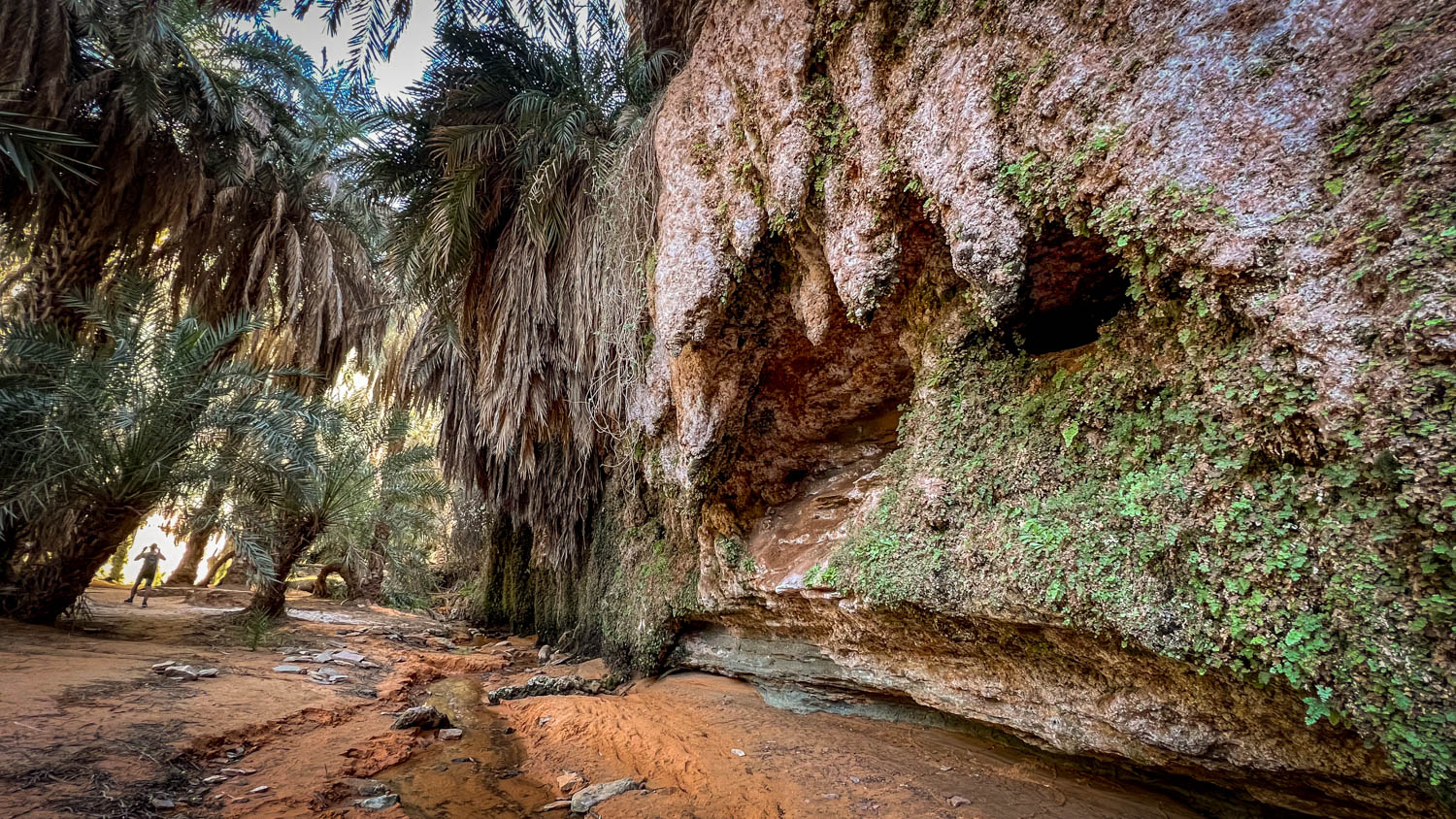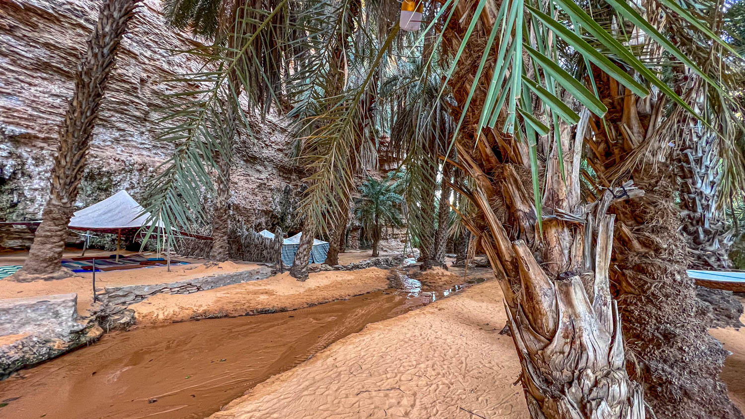 Après avoir laissé les véhicules, nous continuons à pied sur le petit sentier qui serpente dans l’oasis. Une source jaillit de la falaise et des petits bassins permettent de se rafraîchir à l’ombre des palmiers. Un campement installé près de la source propose ses tentes aux visiteurs pour la nuit.