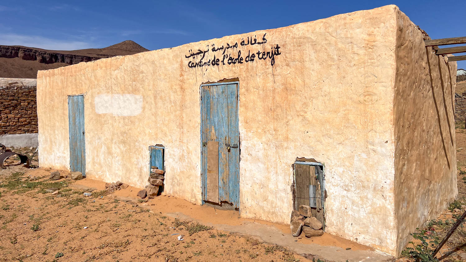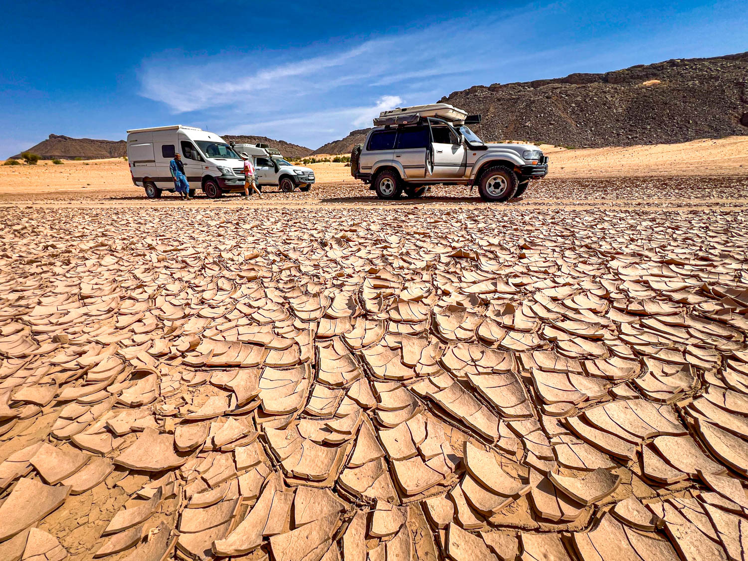 Départ à 10h00 de Terjit vers la vallée blanche, une faille enserrée entre des falaises envahies peu à peu par un sable très blanc d’où son nom. La piste débute par 10 kms de terre rocailleuse parfois toute craquelée. Cela ressemble à une immense tablette de chocolat….Nous traversons quelques hameaux puis après avoir bien dégonflé, les pneus, nous nous engageons dans l’oued El Abiod très sableux qui dessine la vallée blanche.