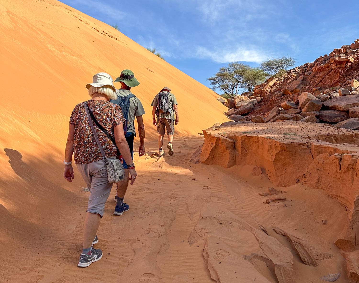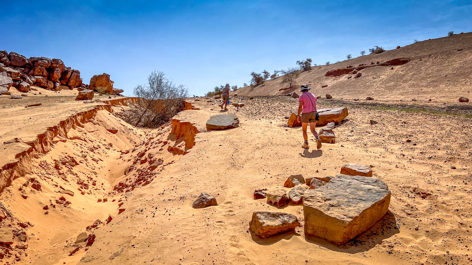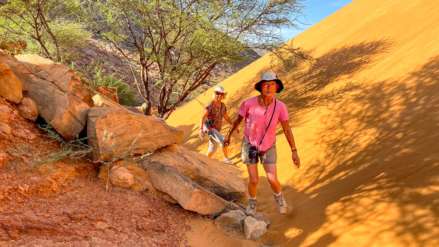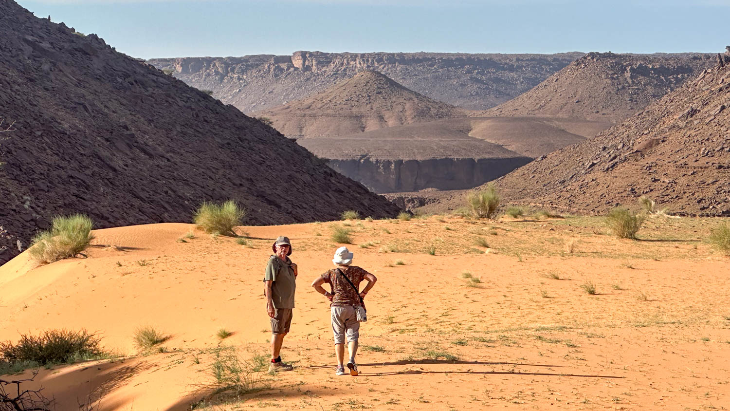La piste d’approche très sableuse monte doucement empruntant un joli canyon de sable. C’est finalement à pied que nous gravirons la passe car elle est ravinée et bien trop abrupte même pour les Toyotas. Pique-nique à l’ombre au pied de la passe. Il fait très chaud, sans doute près de 40 degrés à l’ombre.