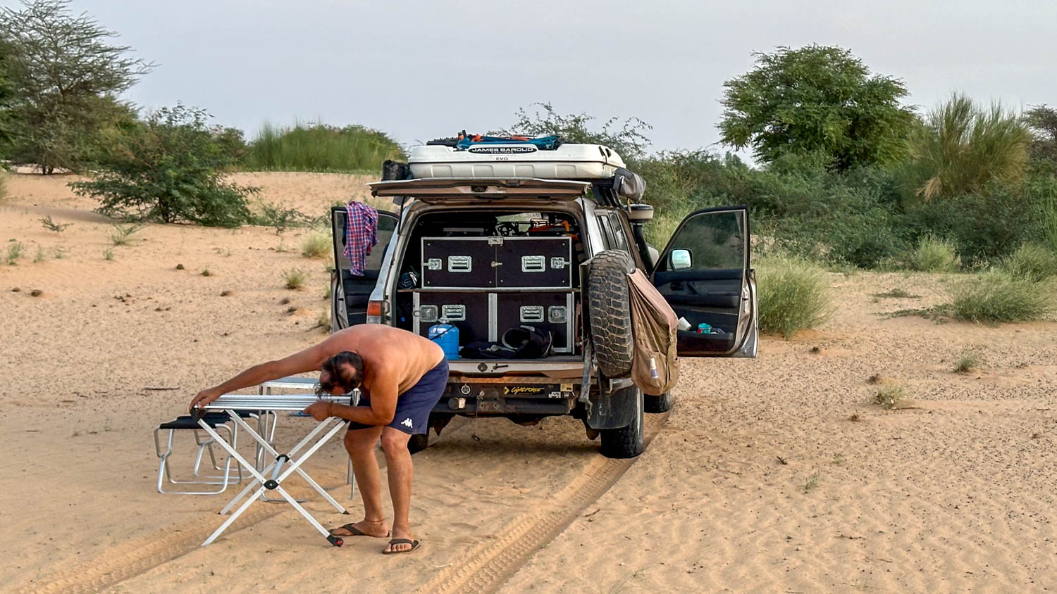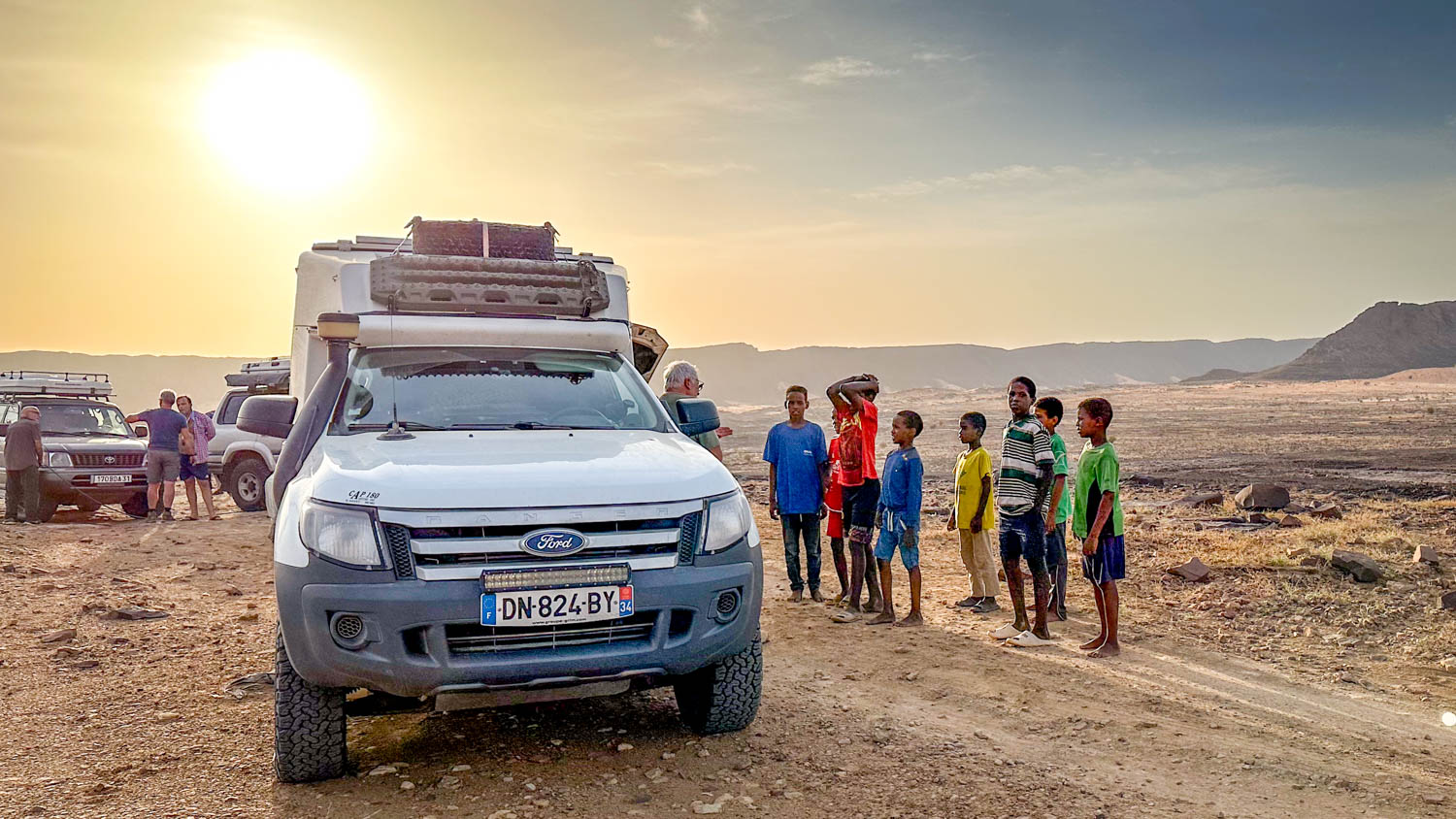 Matinée réparations et ravitaillement à Atar. En effet d’autres petits soucis sont apparus à l’arrivée : perte du pot d’échappement du Toyota de Pierre, déformation d’une jante du Sprinter et pneu abîmé et surtout embrayage du pick up du guide cassé à remplacer. À 8h00 les véhicules sont au garage et tout est réparé vers midi. Ahmed connaissait la bonne adresse…