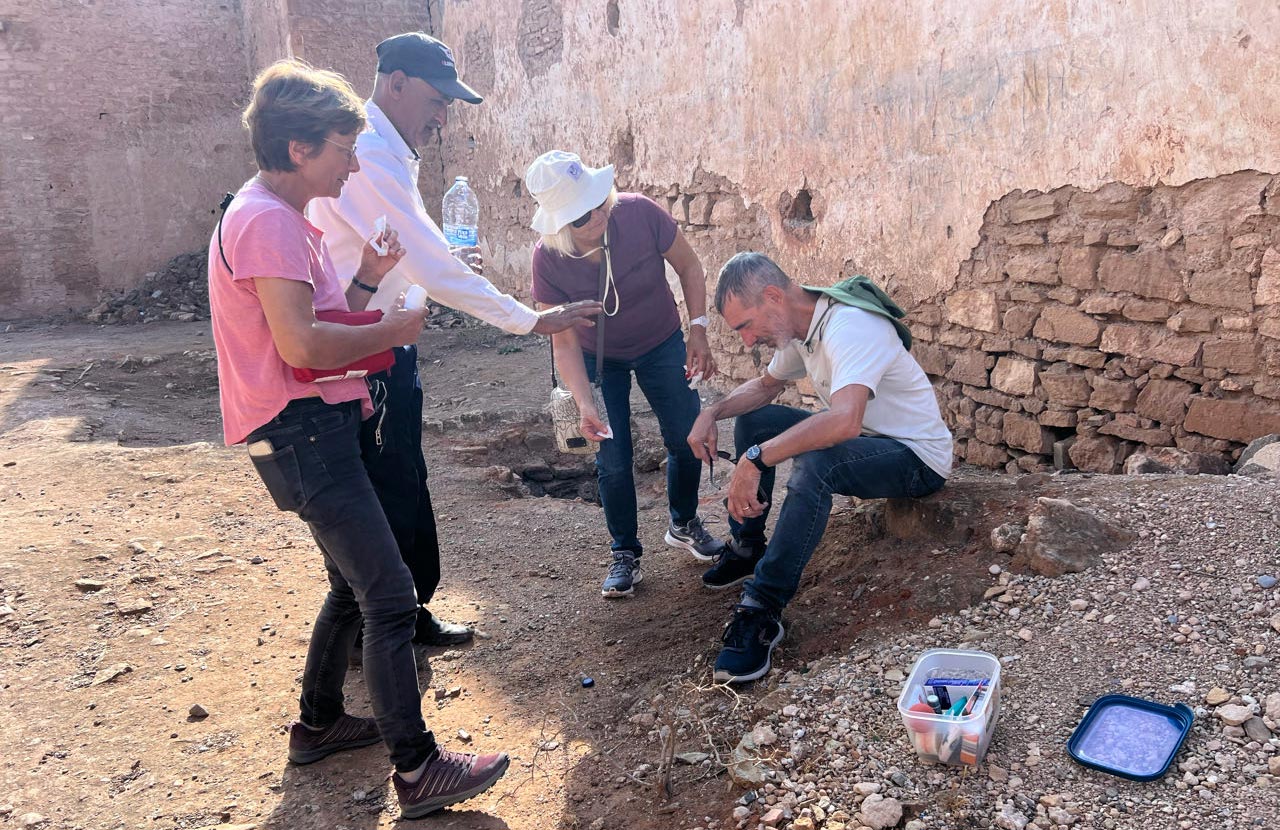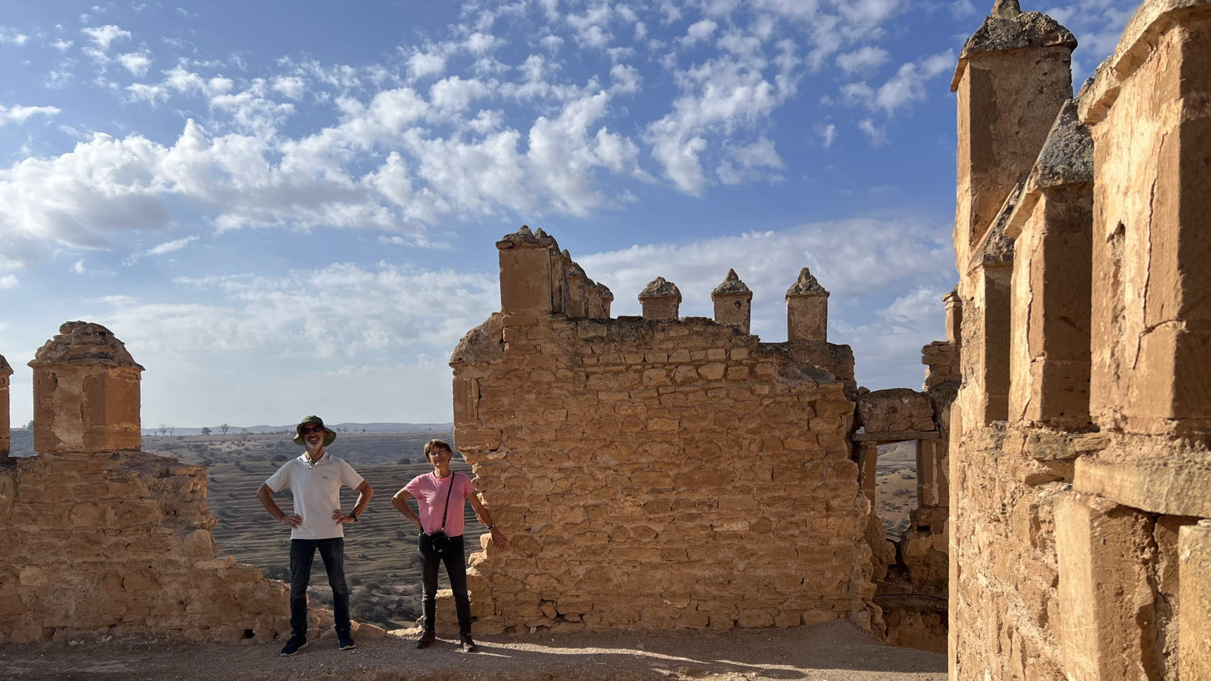 Surprise, à notre réveil le gardien de la kasbah vient nous servir de délicieuses crêpes chaudes (msemens) avec du miel et du thé vert ( « whisky marocain « ). La journée débute bien… Commence ensuite la visite de la Kasbah escortés de notre ange gardien. Le sultan Moulay Ismaïl, à l’origine de la forteresse, a régné sur le Maroc de 1672 à 1727, en tant que deuxième souverain de la dynastie alaouite. Il détient le record du monde Guinness du plus grand nombre d’enfants engendrés par un homme (888!) 🍆💦. Il faut dire qu’il avait 500 femmes !!!! C’est alors que survient le 1er incident : Claude que l’on sait distrait…😜 oublie de baisser la tête et se prend une poutre sur le crâne. Nous le retrouvons par terre et ….ensanglanté 🩸🩸🩸. Christine et Louis Michel courent chercher la pharmacie tandis que le gardien lui verse une bouteille d’eau sur la tête, ce qui arrête le saignement. On voit qu’il a une certaine habitude😂😂😂