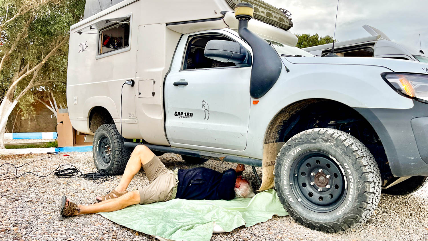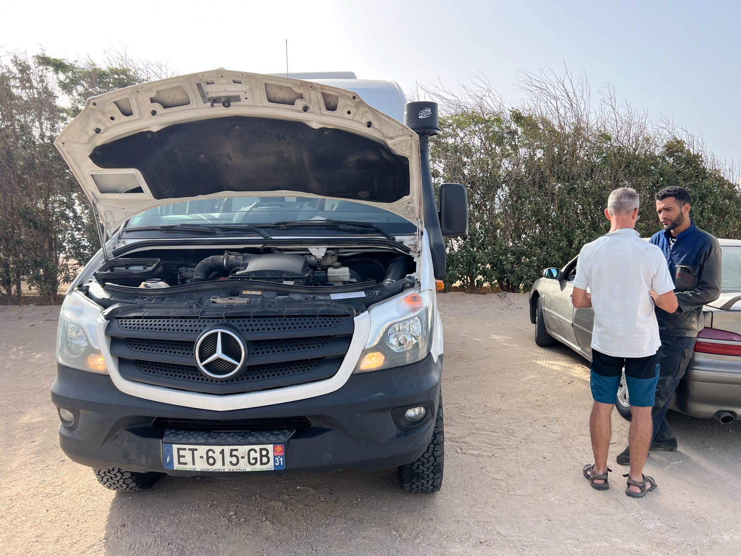Le Sprinter en a décidé autrement sur le 1er km de la piste menant à la dune blanche : voyant rouge alternateur/batterie allumé, injonction de couper le moteur et plus de direction assistée….Retour à vitesse très réduite sur le parking où nous avions passé la nuit…et Claude voit qu’il s’agit de la courroie d’alternateur et accessoires qui a sauté. Heureusement les marocains sont de très bons mécaniciens et quelques heures plus tard tout est réparé sur place….