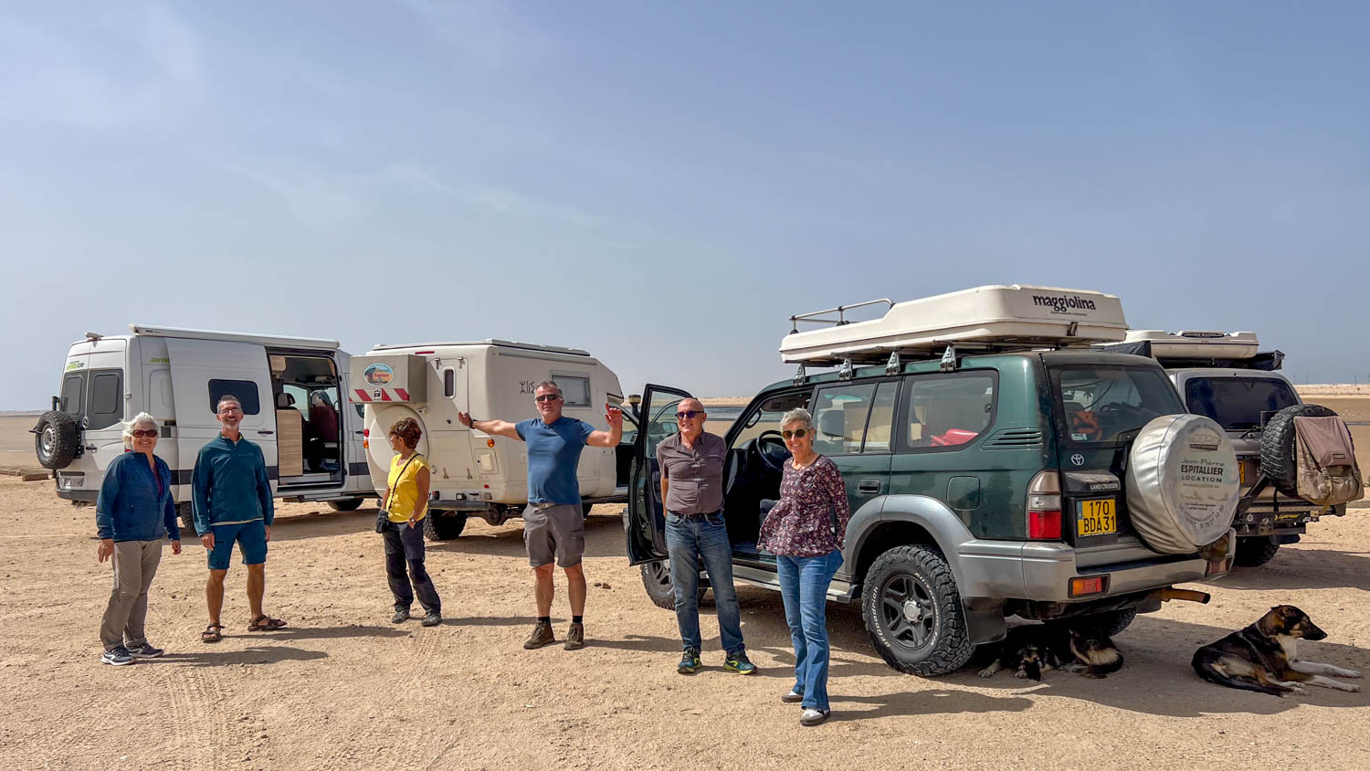 Après un petit déjeuner fort sympathique pris tous ensemble près de nos voitures, Pierre et Bernard nous quittent pour aller à l’aéroport de Dakhla récupérer Sylvie et Fred qui nous rejoignent aujourd’hui . Le groupe au complet se retrouve au PK25 puis nous partons en tout debut d’après midi.
