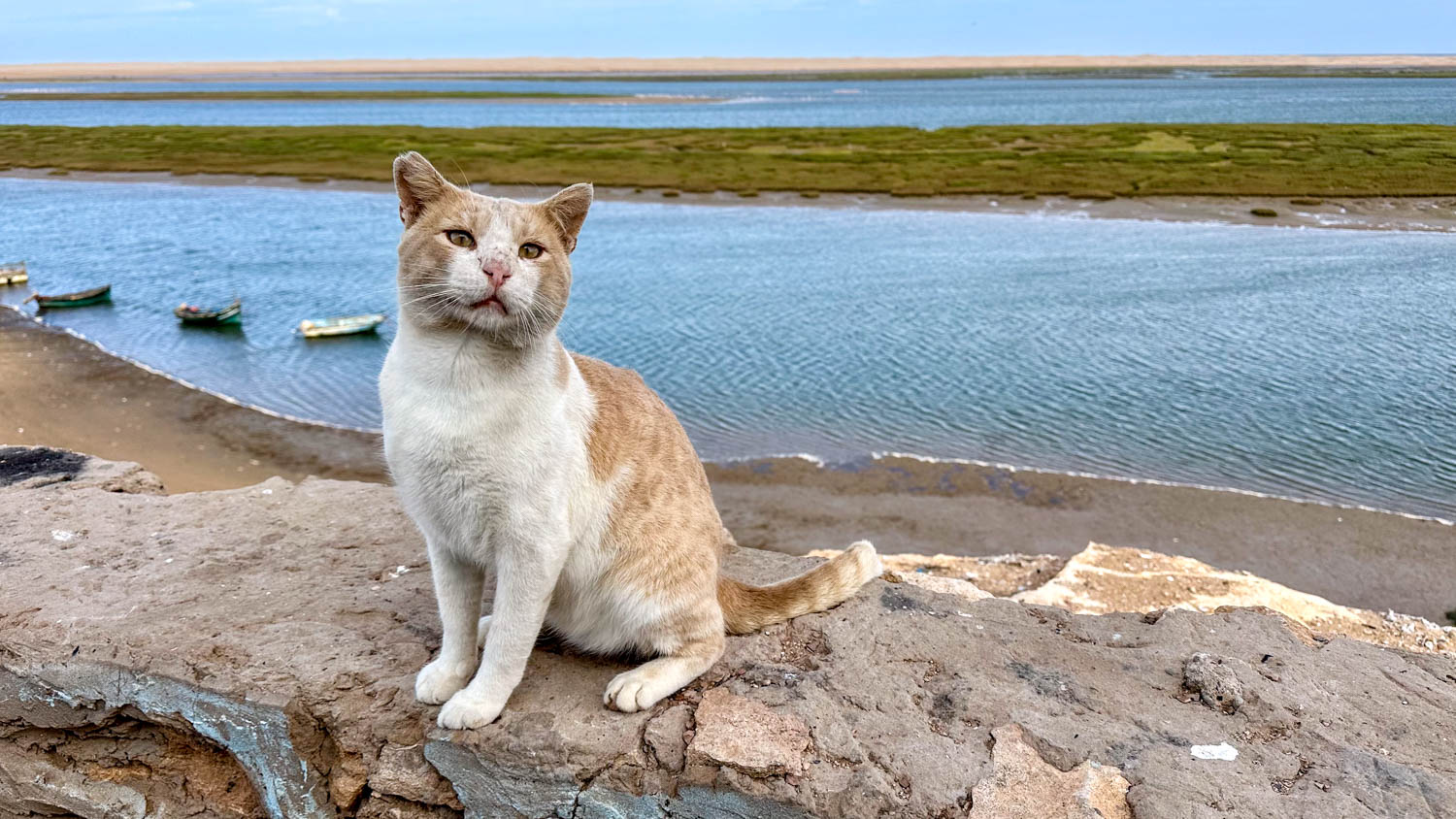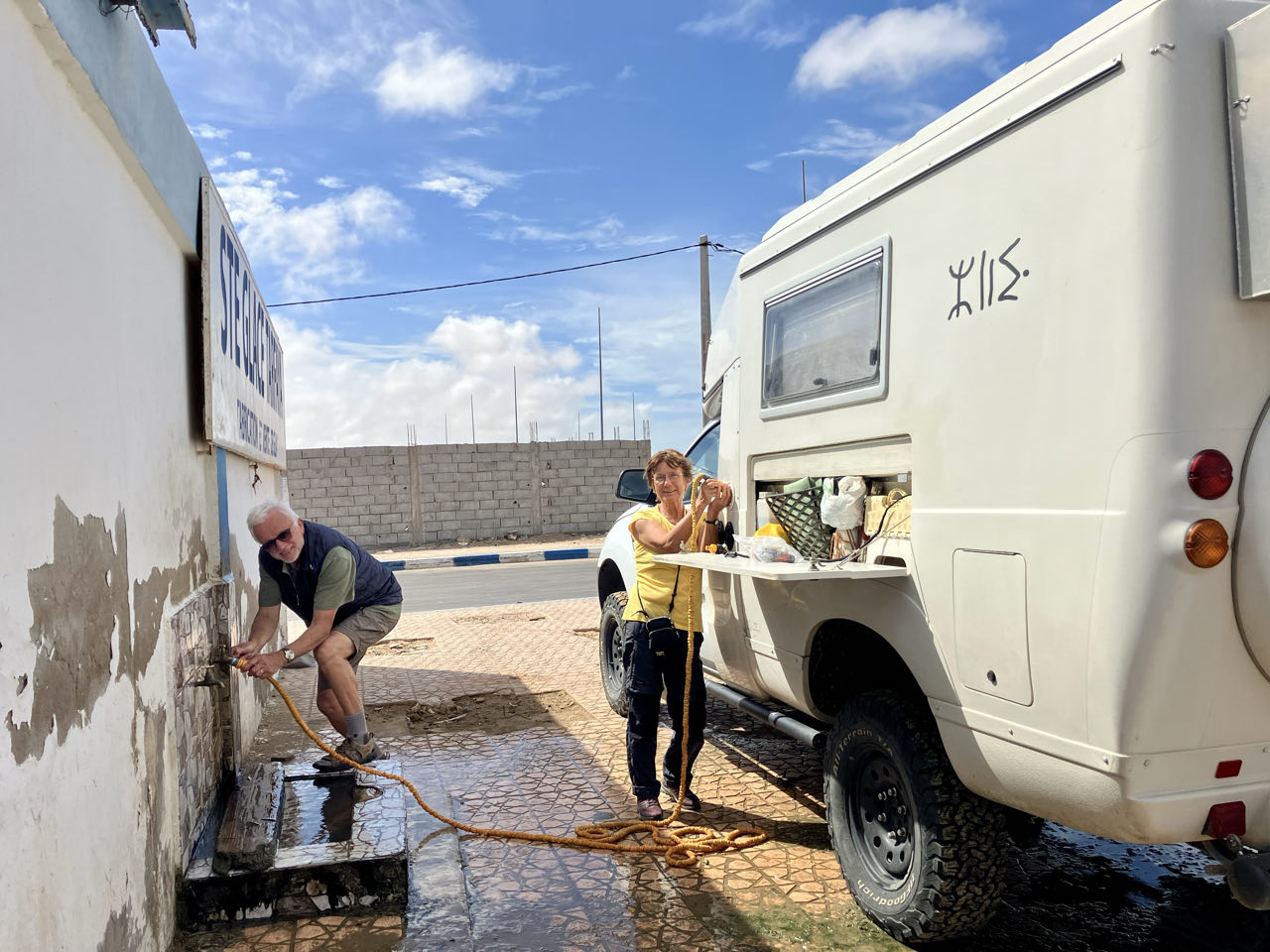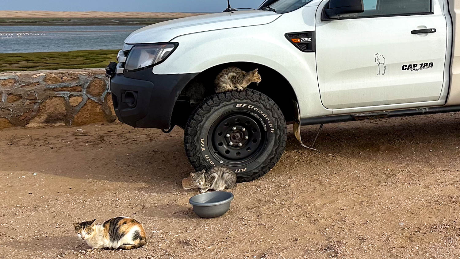 Petit déjeuner avec nos amis les chats avant de quitter la lagune. Arrêt à Tarfaya pour faire le plein des réservoirs d’eau, puis pique nique au bord de l’océan. Nous prenons ensuite la direction de Laâyoune.