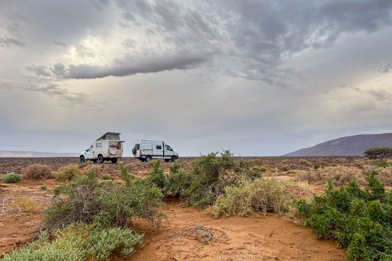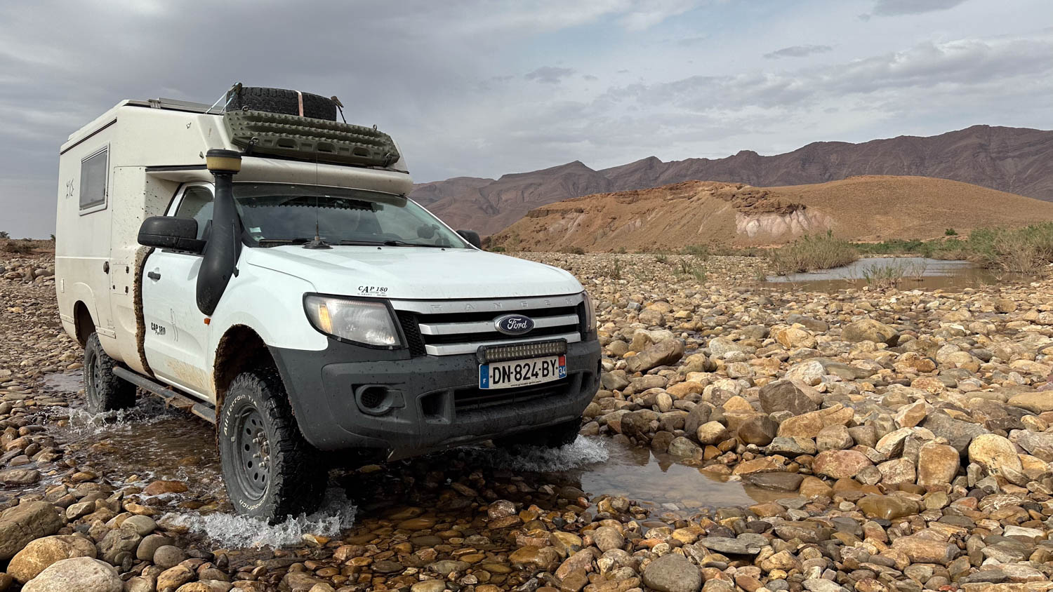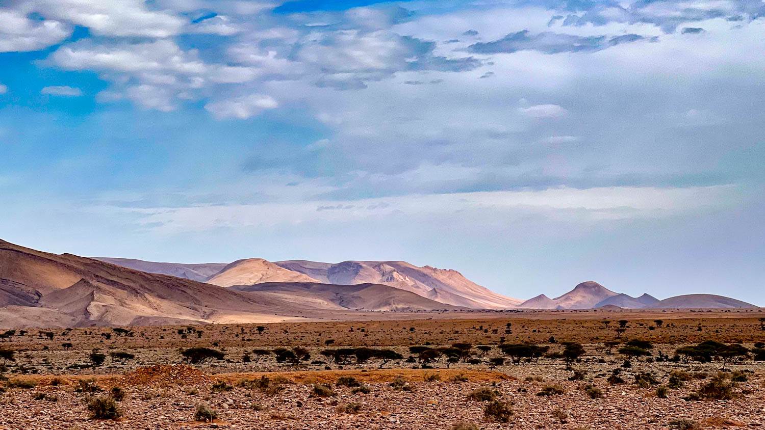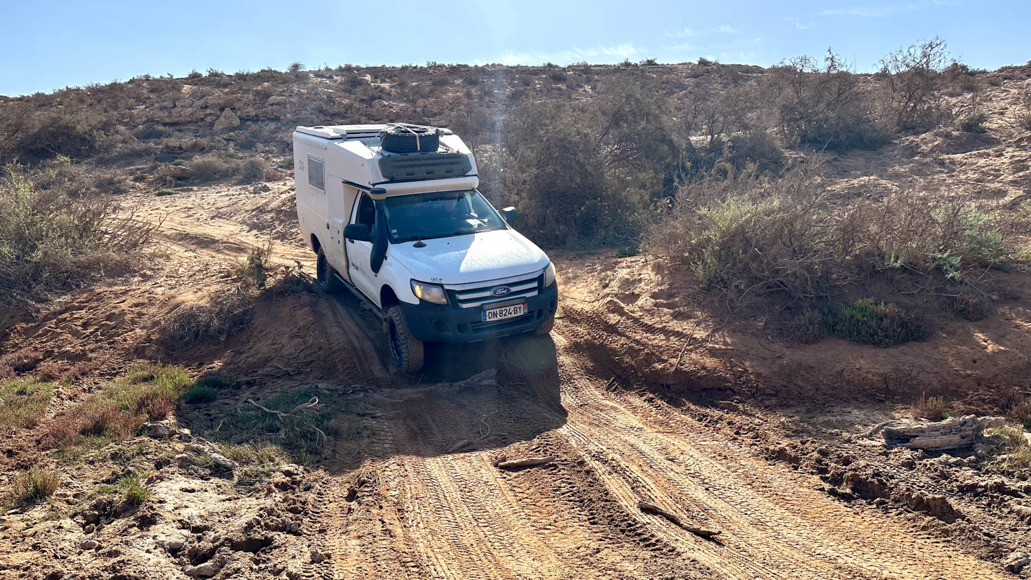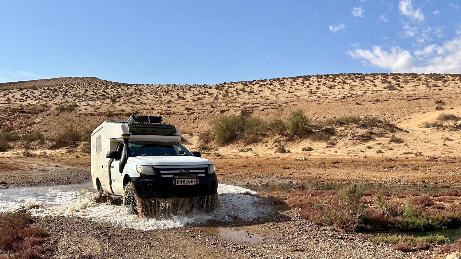 A l’arrivée à Tan Tan la pluie nous arrose généreusement de ses grosses gouttes. Courses de gasoil, fruits et légumes et nous repartons par une très belle route traversant la montagne ocre jusqu’à la ville de Msied. En effet, nous ne souhaitons pas nous aventurer dans la première partie de la piste, réputée assez technique et qui nous fait craindre que le Sprinter soit en difficulté (cf Assif Melloul en 2019)