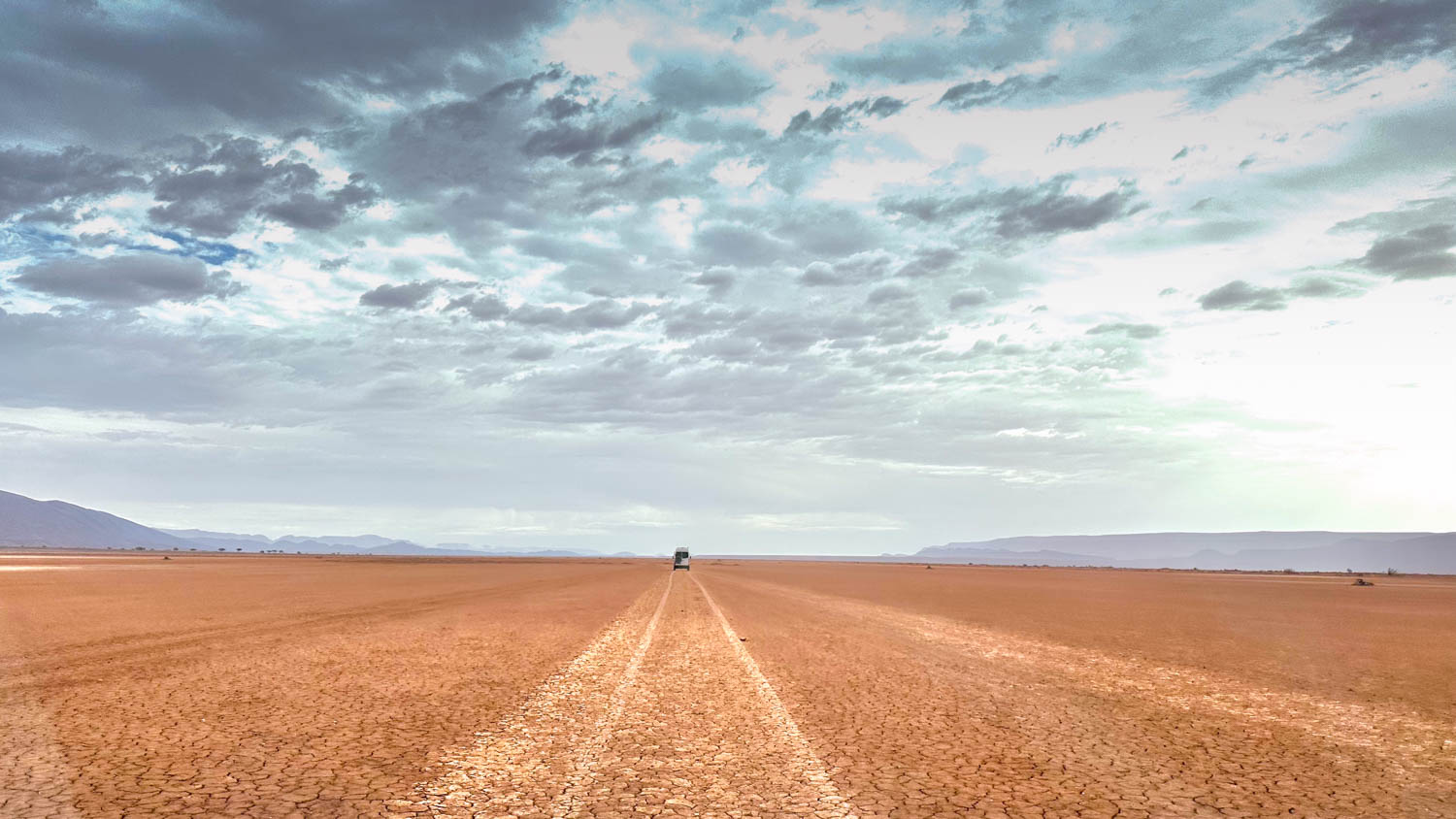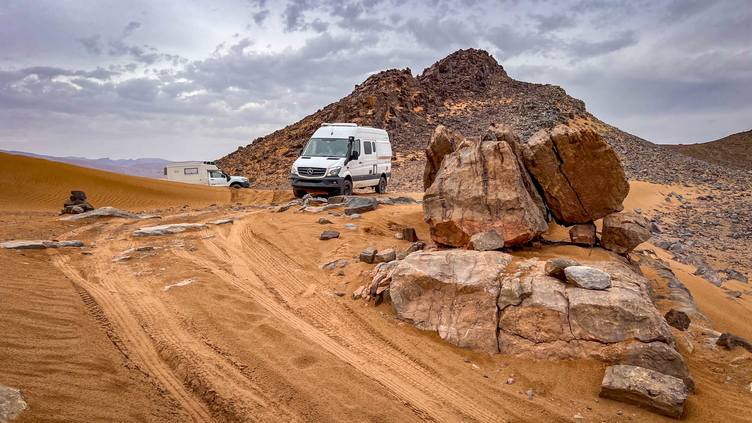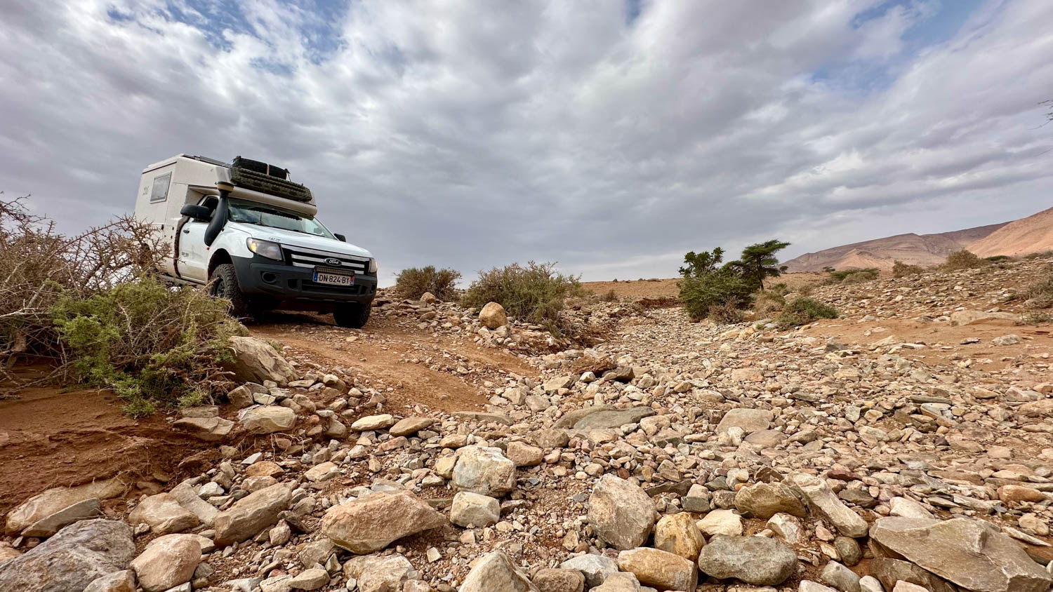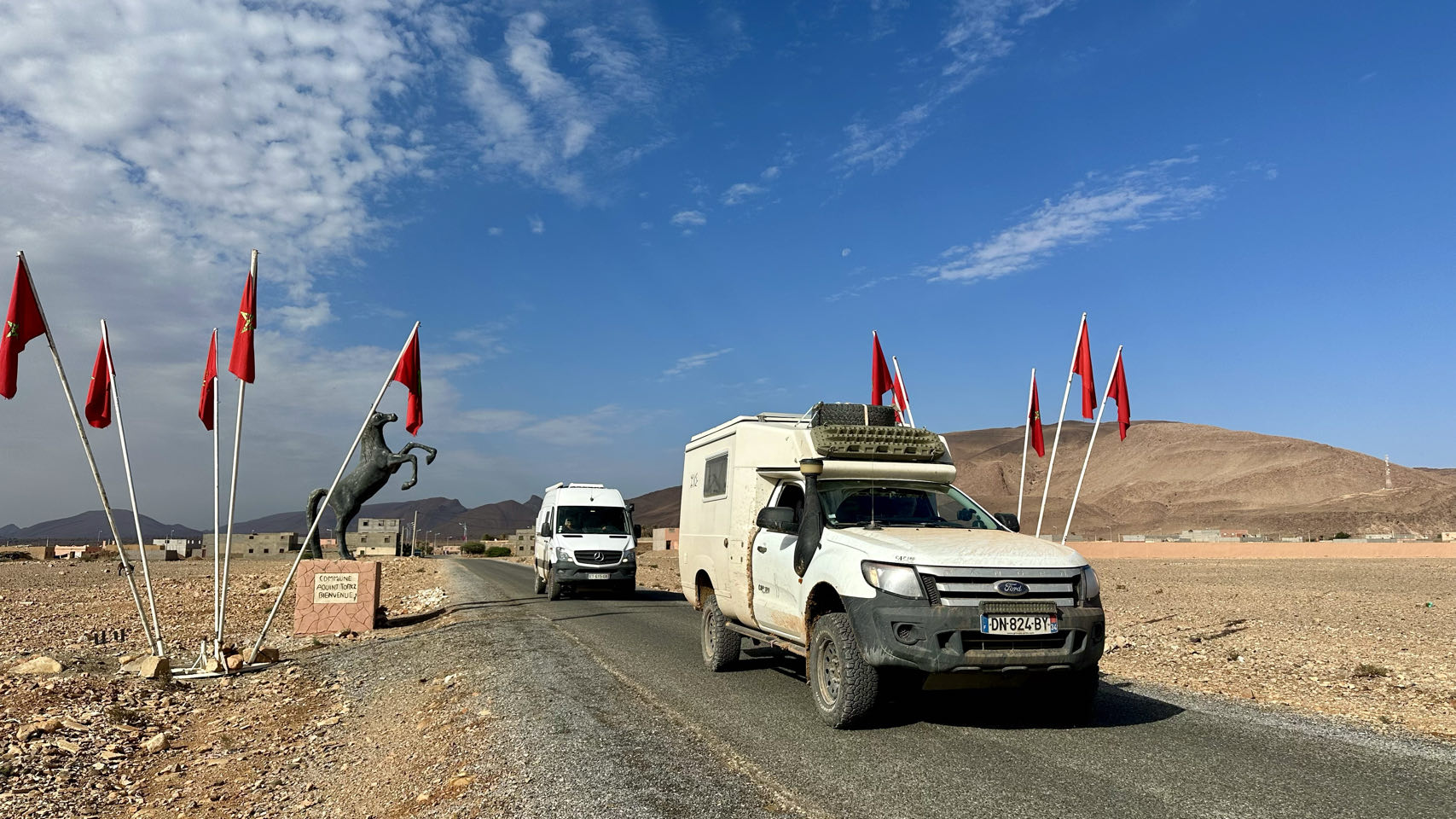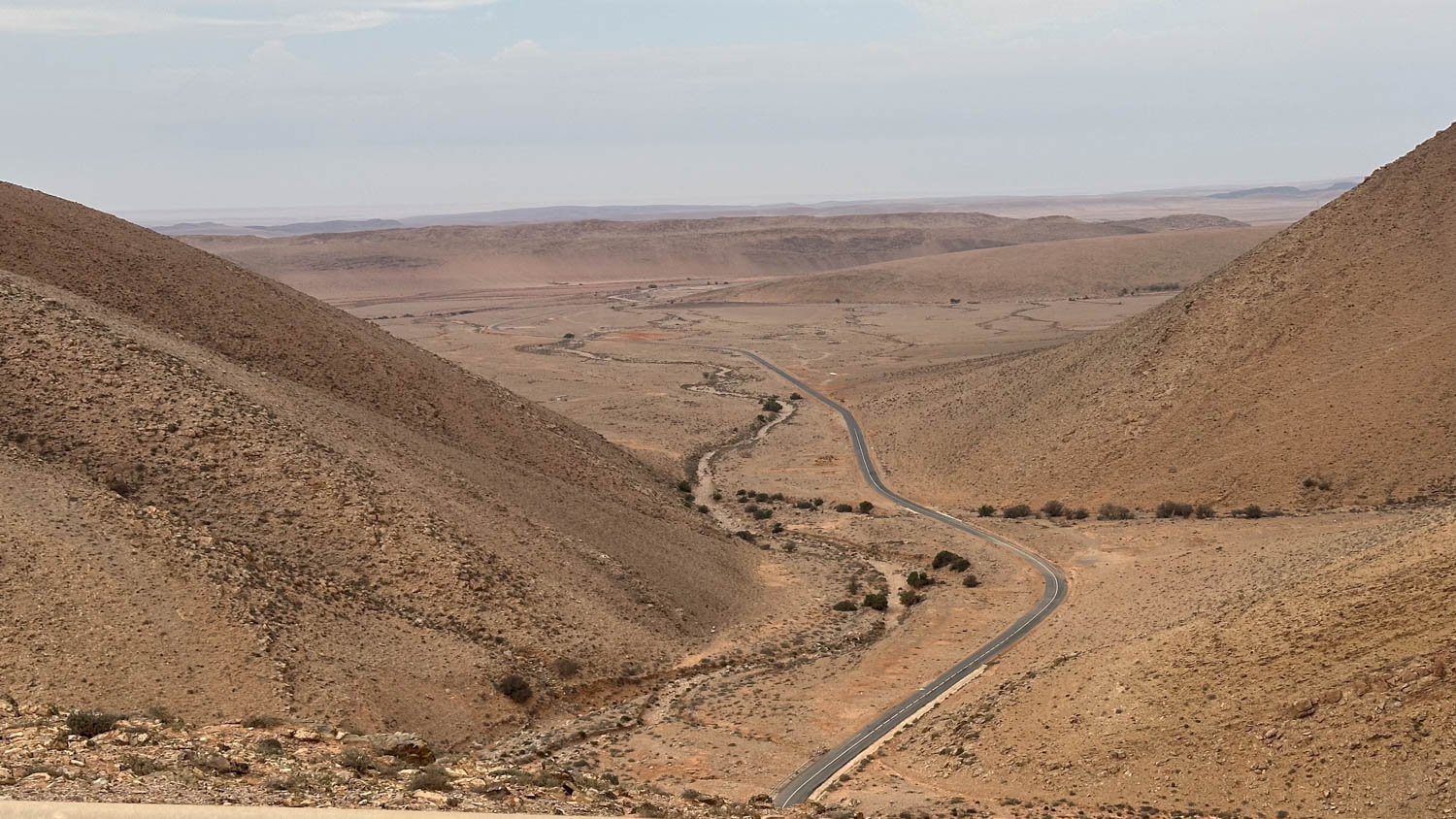 A l’arrivée à Tan Tan la pluie nous arrose généreusement de ses grosses gouttes. Courses de gasoil, fruits et légumes et nous repartons par une très belle route traversant la montagne ocre jusqu’à la ville de Msied. En effet, nous ne souhaitons pas nous aventurer dans la première partie de la piste, réputée assez technique et qui nous fait craindre que le Sprinter soit en difficulté (cf Assif Melloul en 2019)