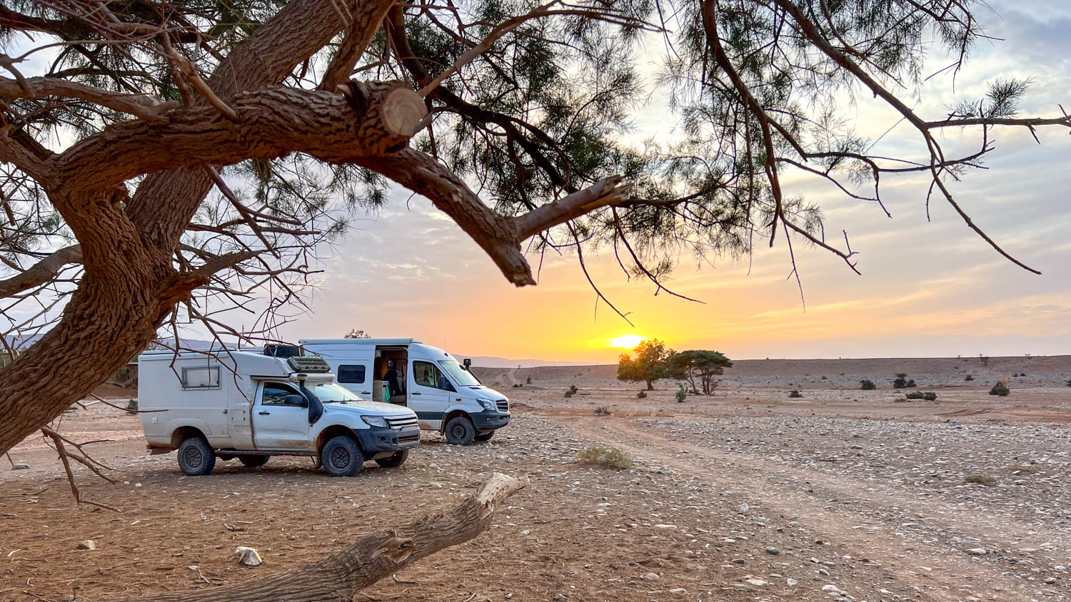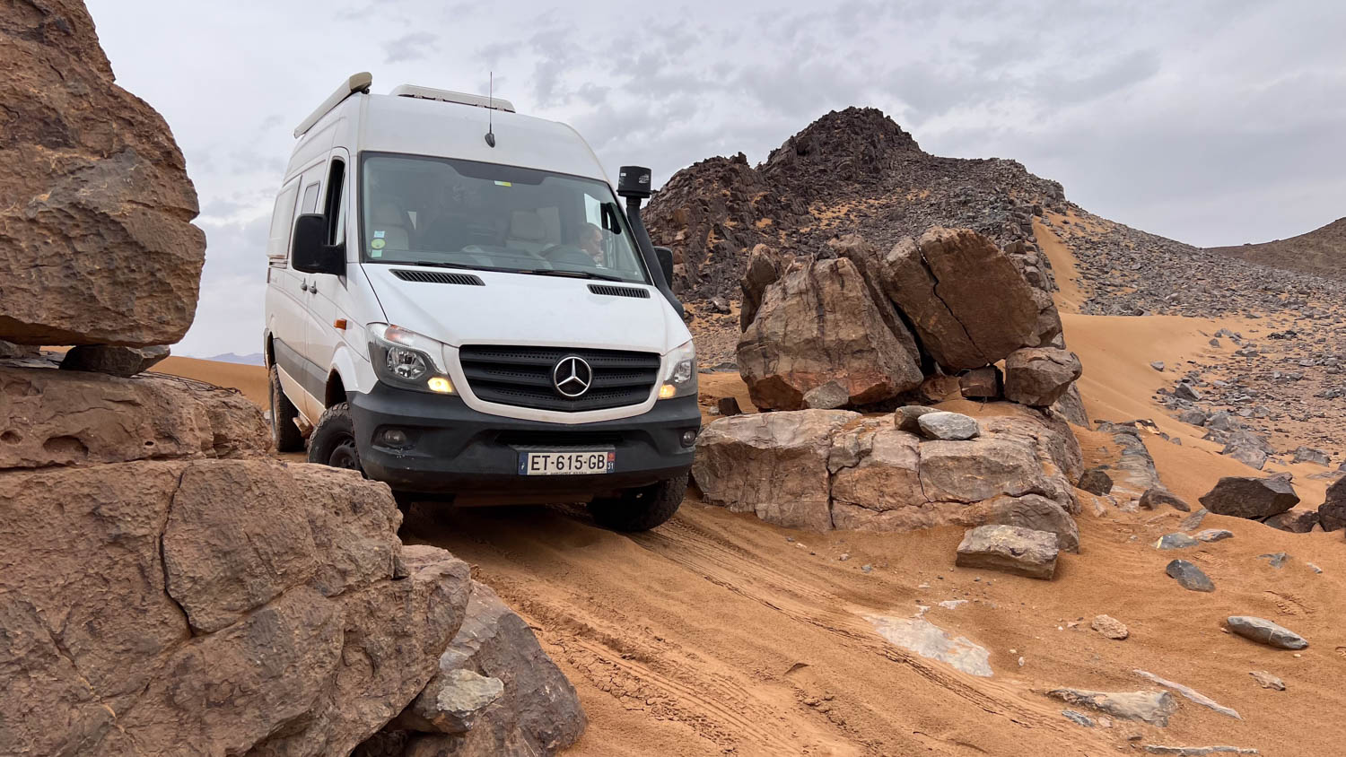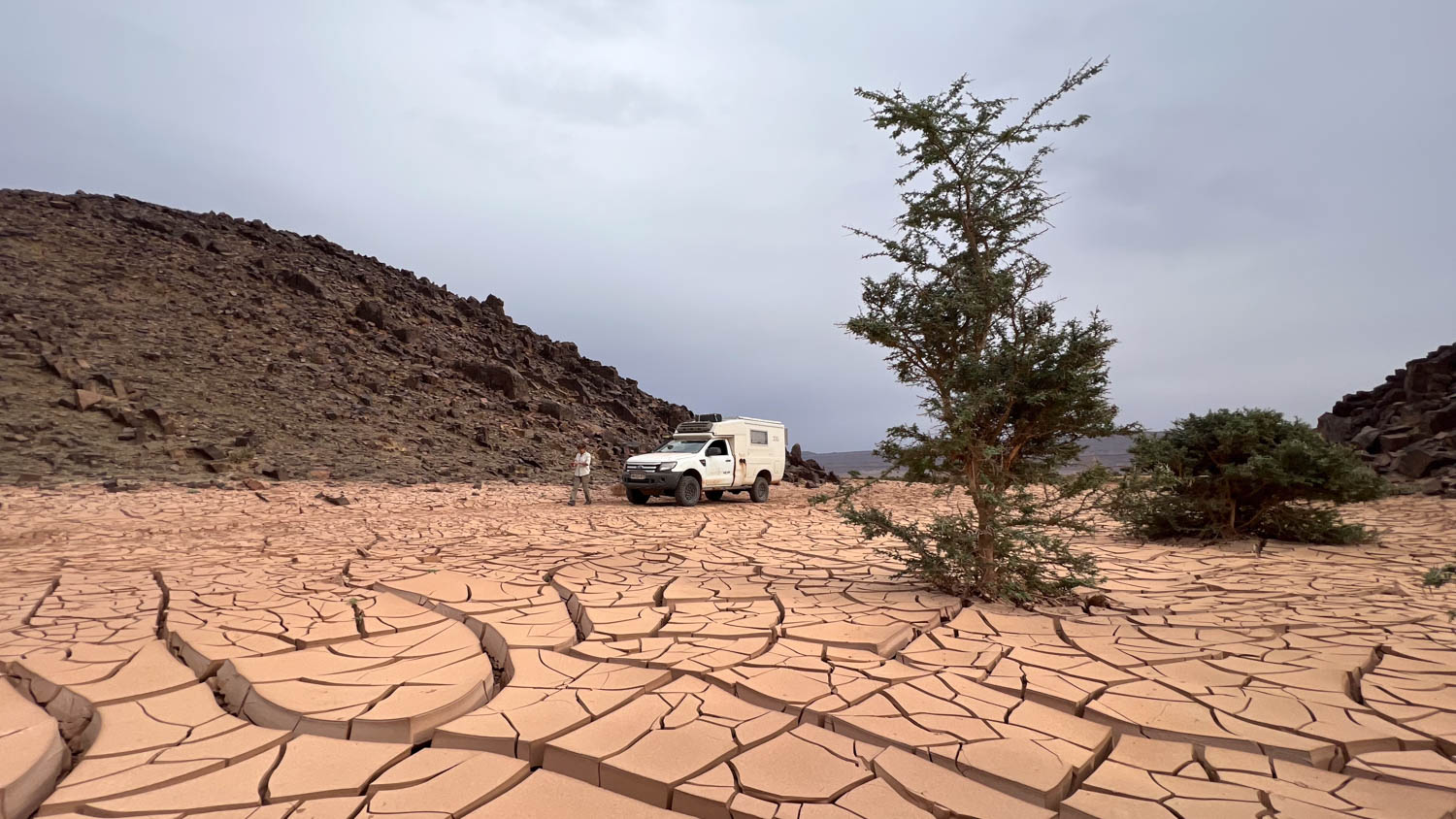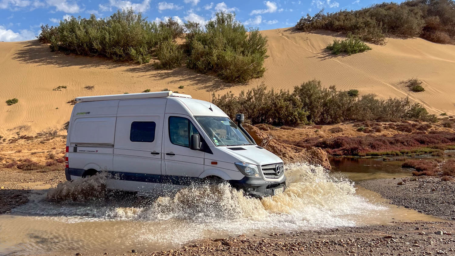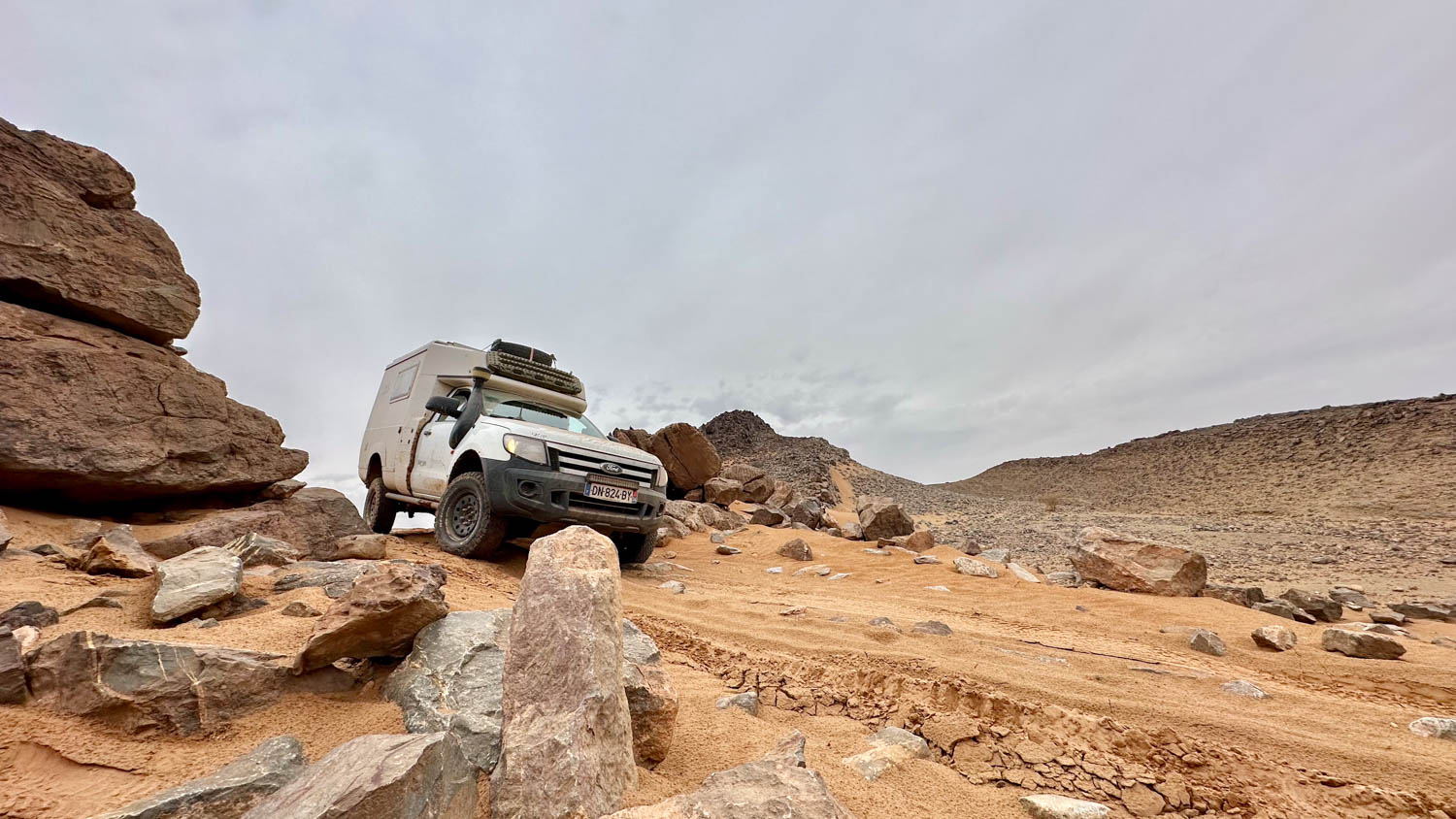 A l’arrivée à Tan Tan la pluie nous arrose généreusement de ses grosses gouttes. Courses de gasoil, fruits et légumes et nous repartons par une très belle route traversant la montagne ocre jusqu’à la ville de Msied. En effet, nous ne souhaitons pas nous aventurer dans la première partie de la piste, réputée assez technique et qui nous fait craindre que le Sprinter soit en difficulté (cf Assif Melloul en 2019)