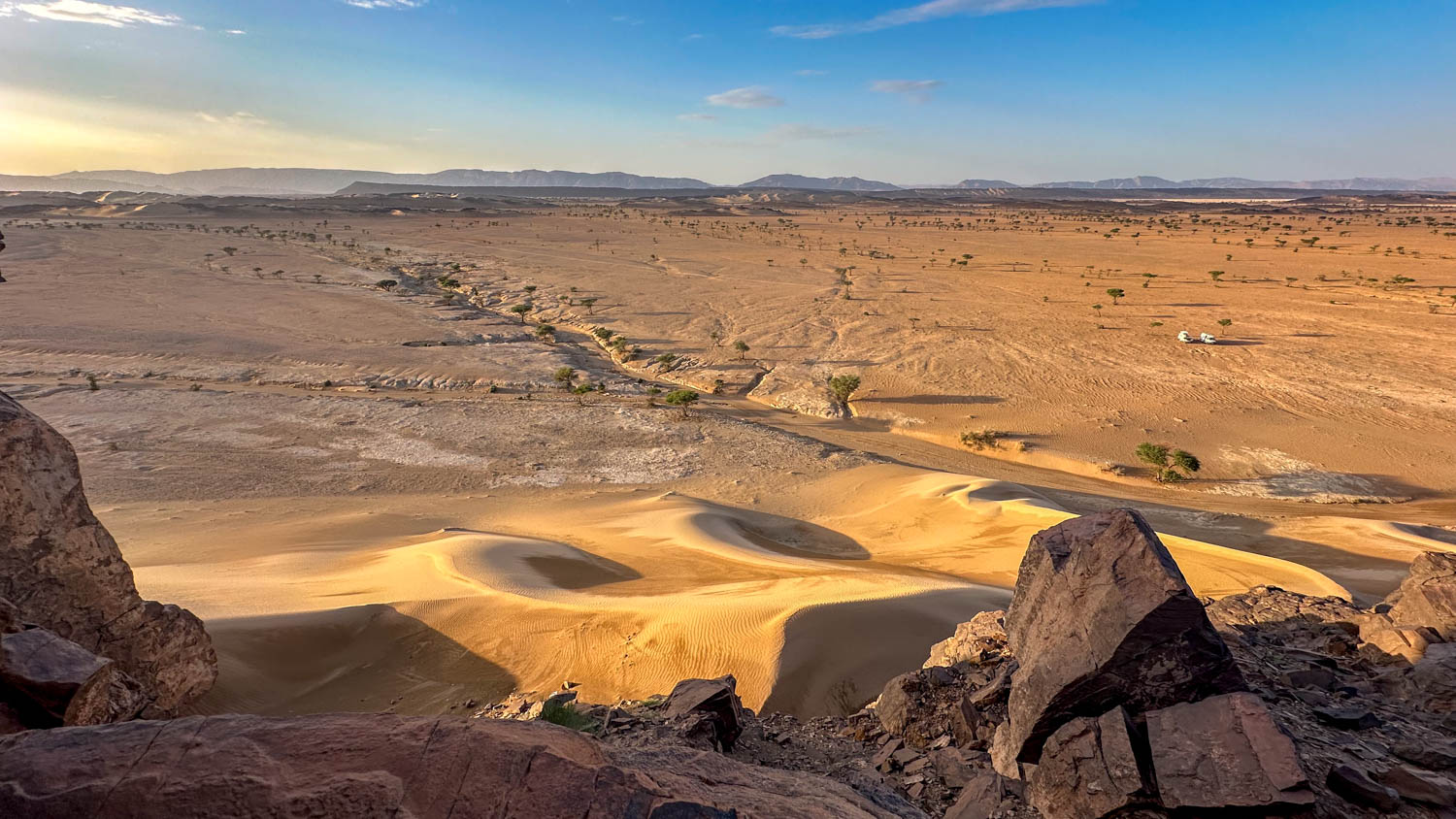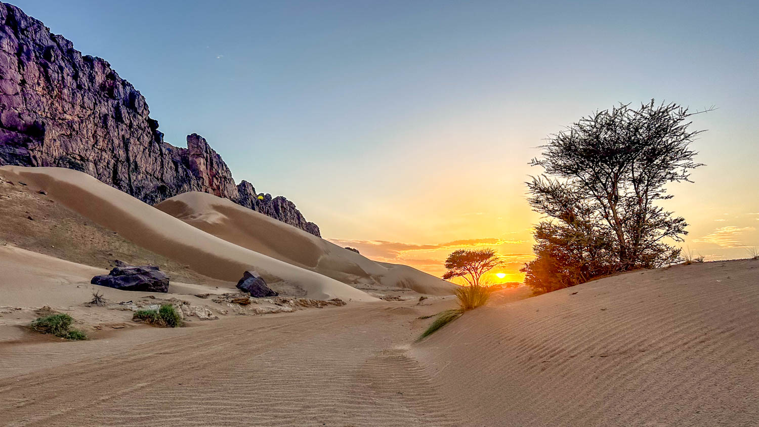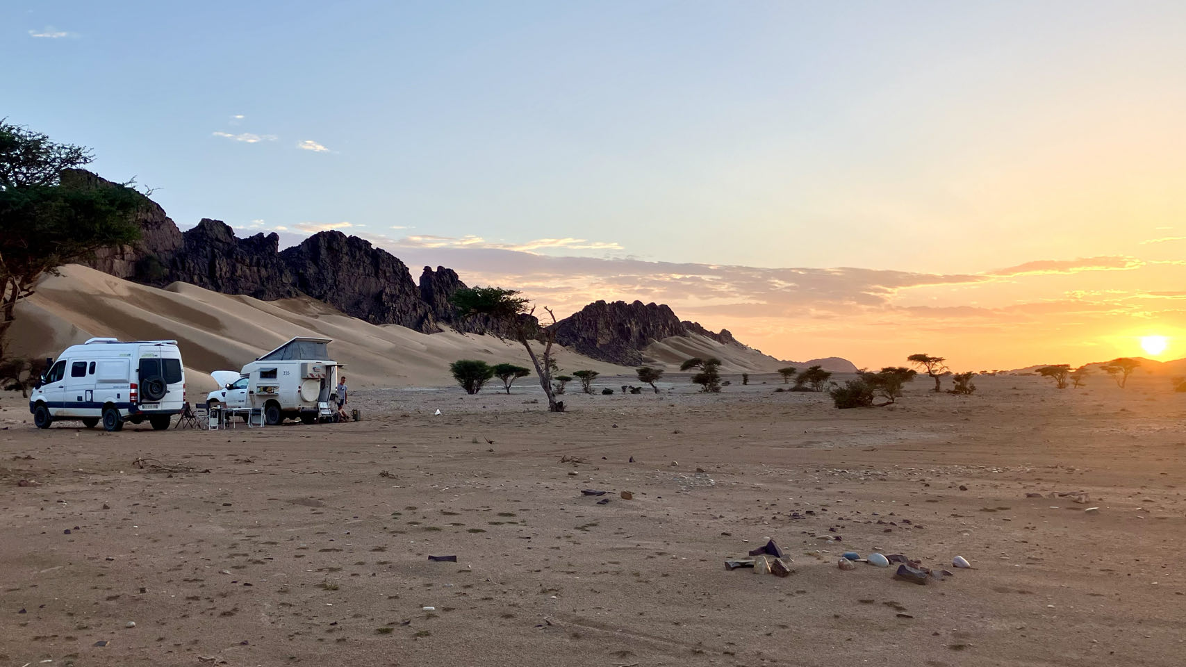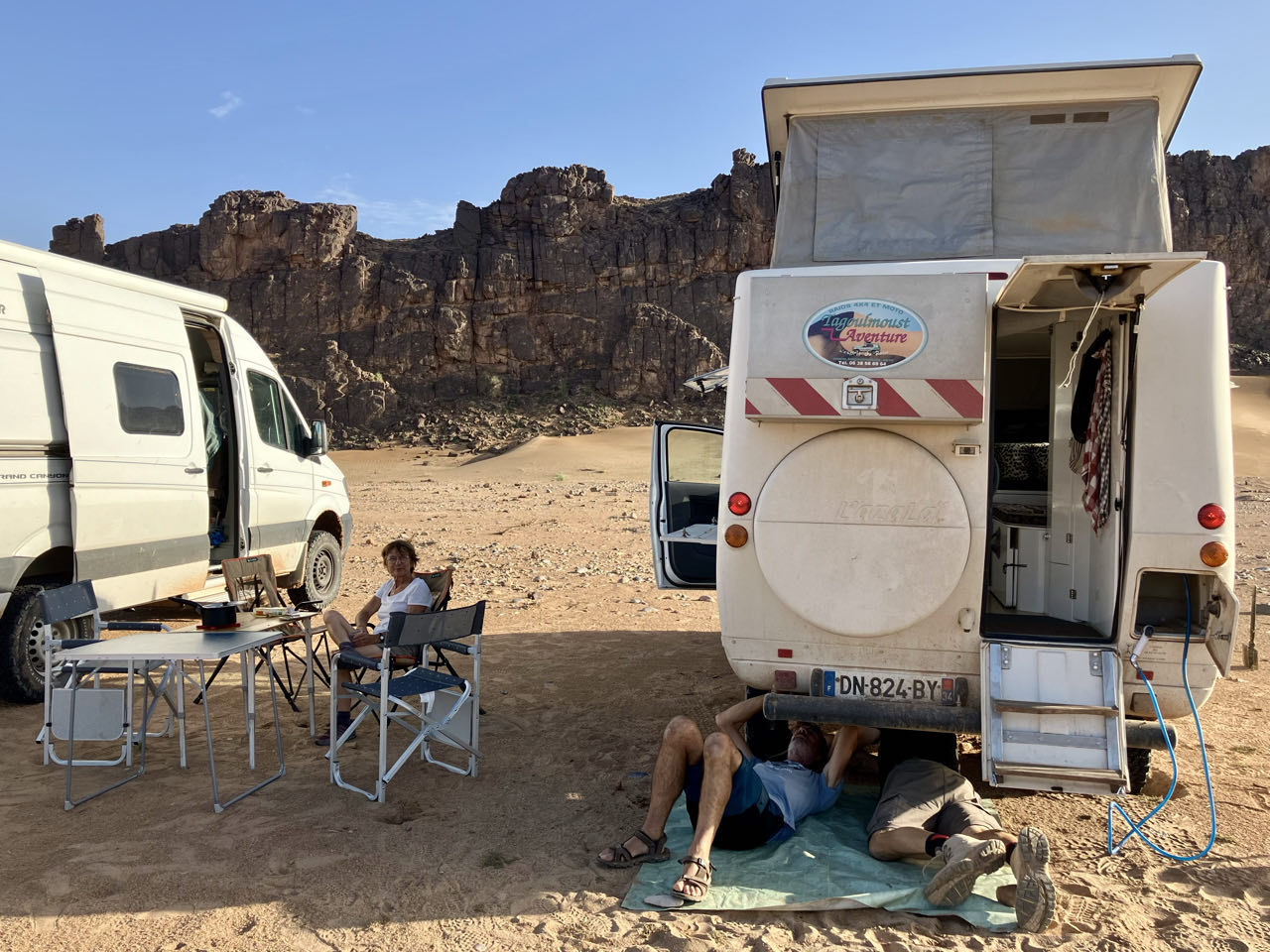 Une fois le minibus tiré d’affaires, nous repartons rassasiés et parfumés sous les youyous enthousiastes de ces dames. Direction Icht où nous nous posons au pied des montagnes ensablées où Claude et Véro ont déjà eu l’occasion de dormir. Jolie balade sur les rochers qui dominent la plaine et le bivouac pendant que Claude et Louis Michel tentent vainement de réparer un défaut électrique apparu sur l’Azalai (dysfonctionnement feux stop et clignotants)