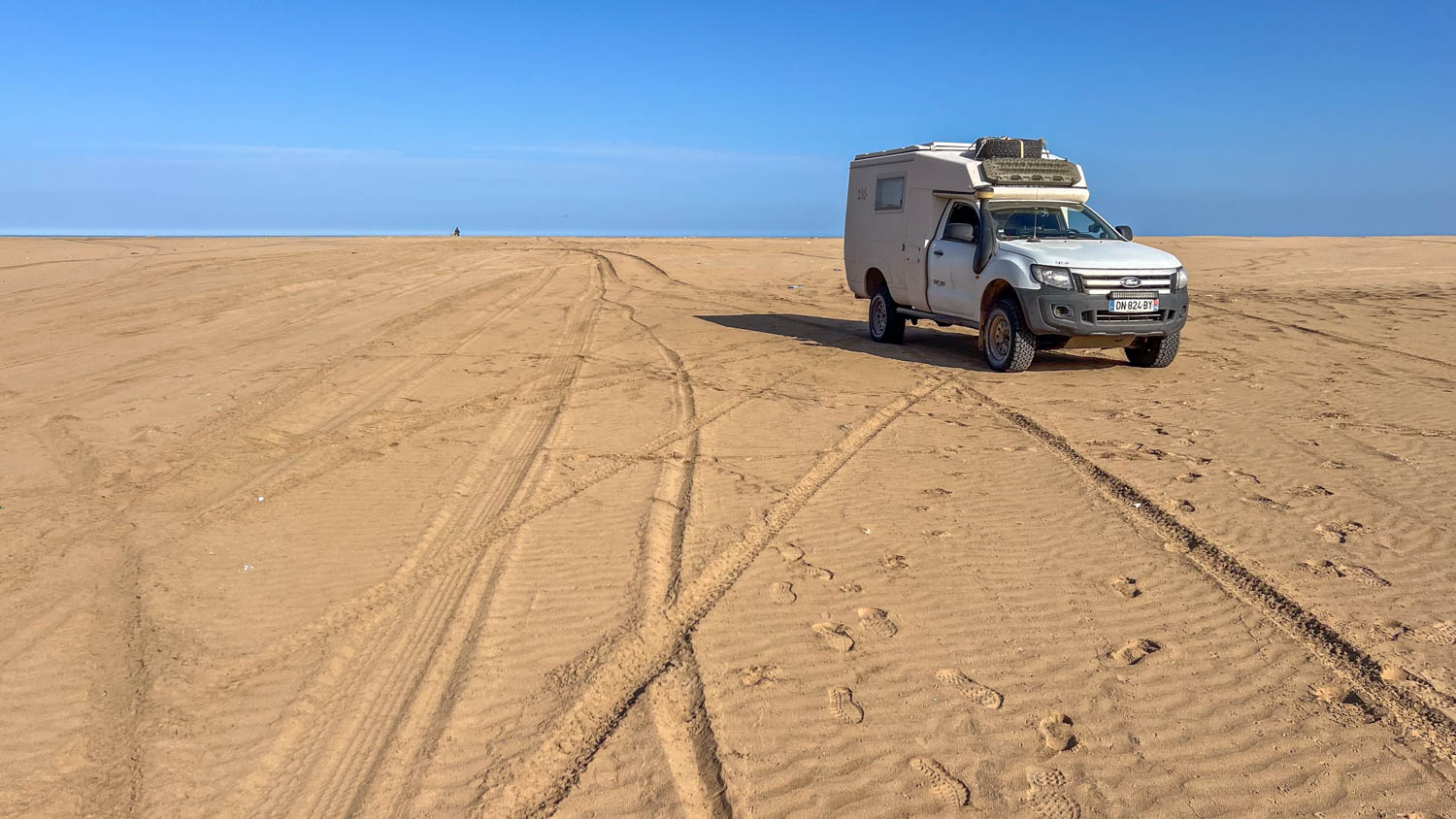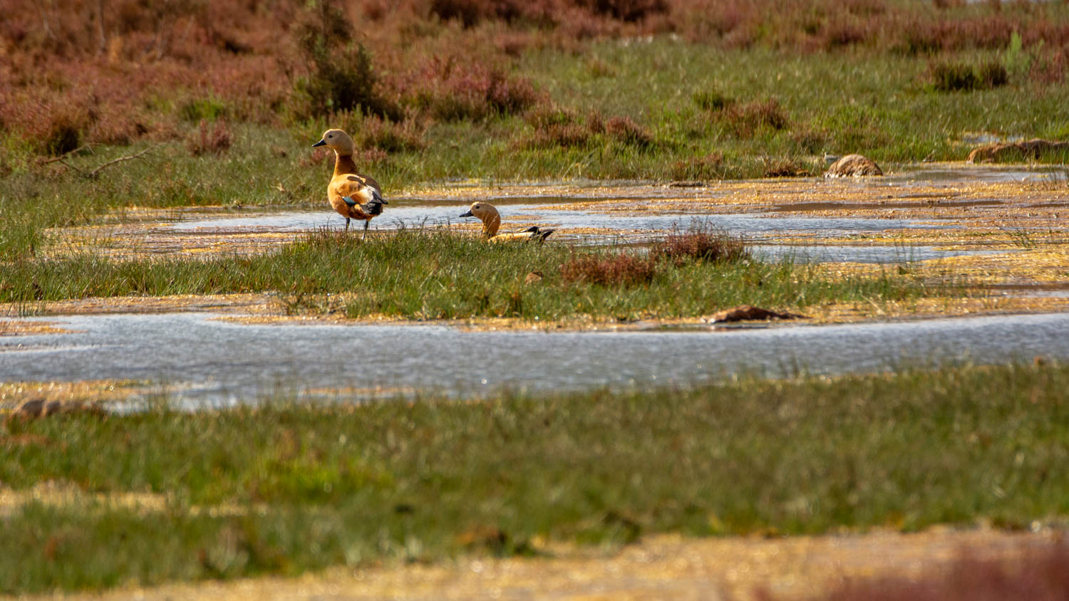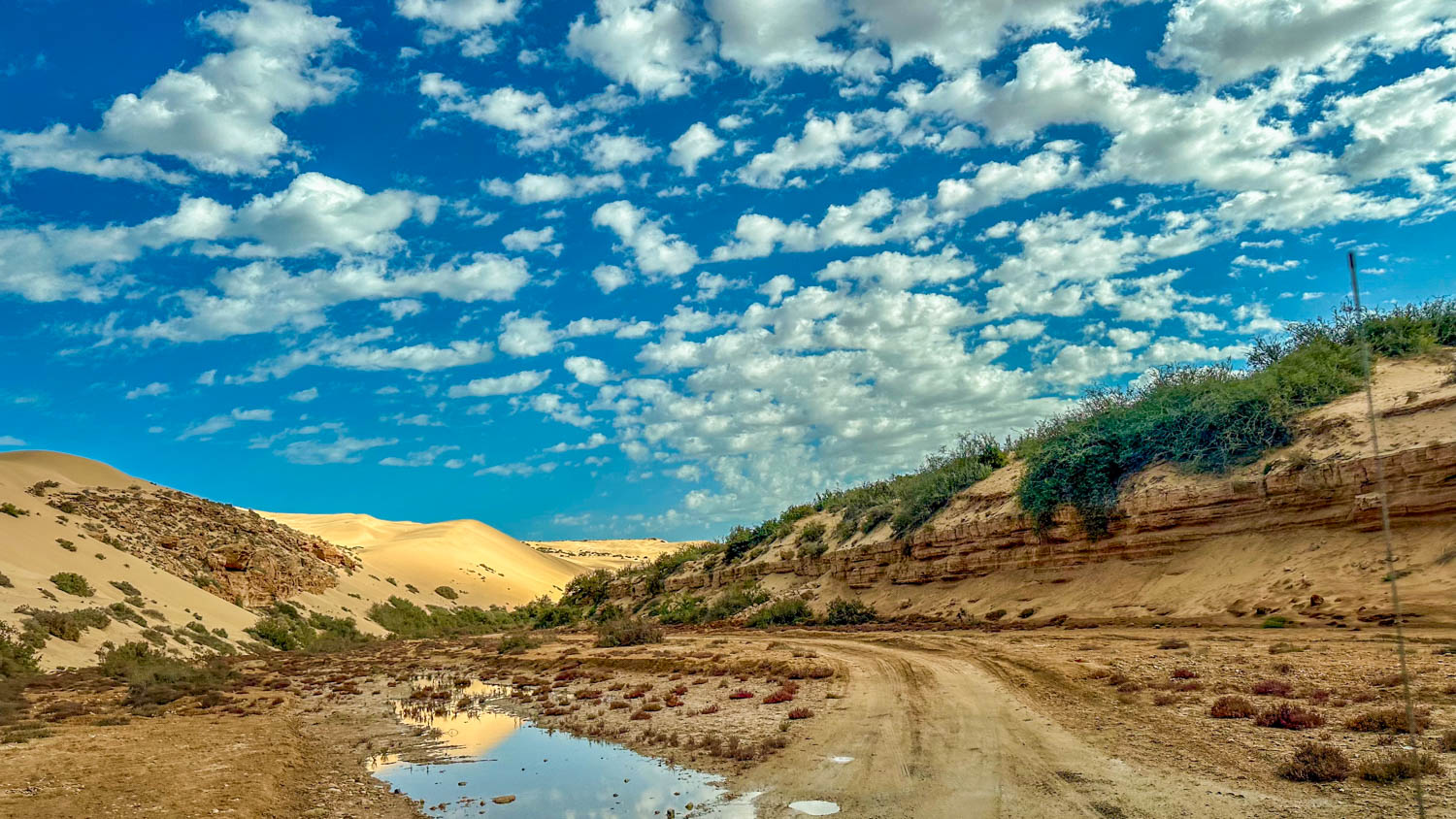 Nous commençons par un petit tour sur l’entrée de la plage blanche avant d’emprunter la piste de l’oued Aoreora qui serpente entre dunes et falaise. Il reste de belles flaques dans le lit du cours d’eau qu’il nous faut franchir parfois. Le fond du canyon est tapissé de verdure et on y croise quelques canards tadornes.