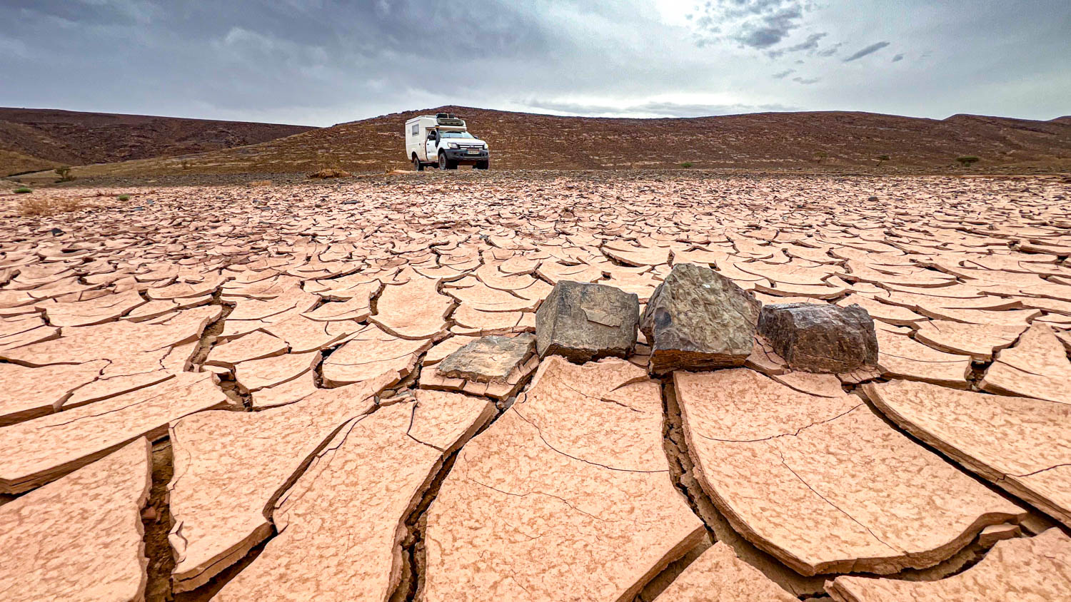 Surprise au bout d’une vingtaine de kms : nous arrivons sur une route goudronnée toute neuve qui se transforme brutalement 6 kms plus loin en piste… Puis le décor change doucement en arrivant sur le Draa où la végétation profite de l’eau qui resurgit par endroit. Un arrêt photo s’impose… Enfin le soleil se montre timidement, le vent est bien tombé et la pluie a cessé. Après une grande étendue caillouteuse ennuyeuse, nous rejoignons la vallée du Draa par une jolie piste accidentée et traversons plusieurs lacs asséchés recouverts d’écailles argileuses dont la taille est parfois impressionnante.
