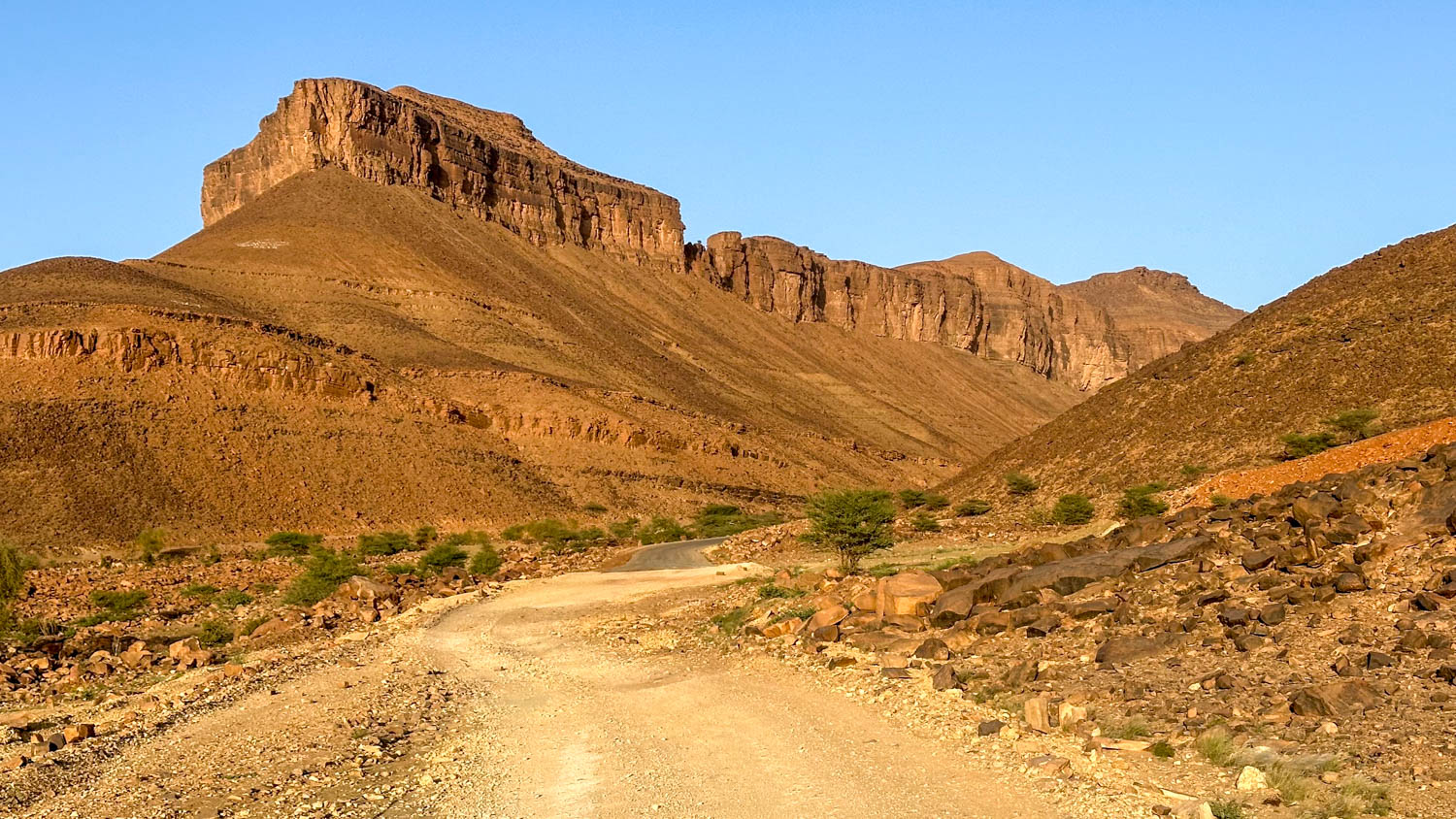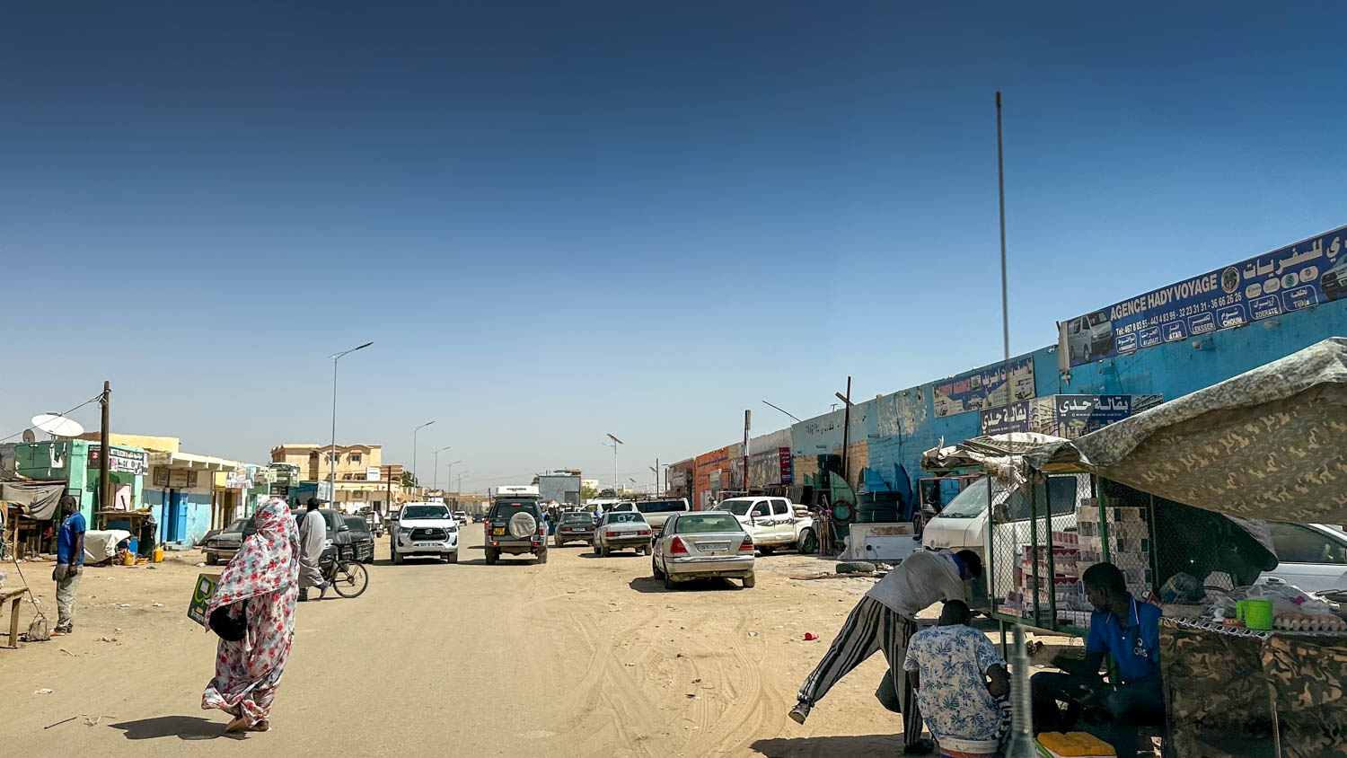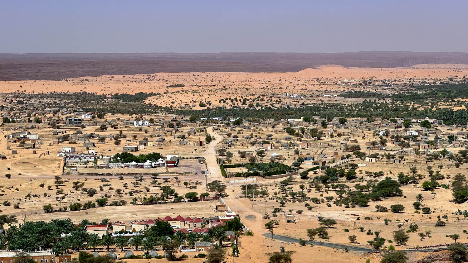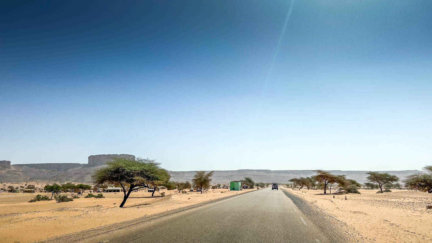 Le paysage change et devient plus rocailleux. Avant de rejoindre Atar, nous obliquons sur une jolie piste qui suit la vallée du village de Tafayet jusqu’à l’oasis d’Azougui. Des petites maisons aux toits de chaume et des abris ronds en osier s’étalent le long de la piste. Des petits étals de viande proposent leur marchandise un peu trop chauffée par le soleil.