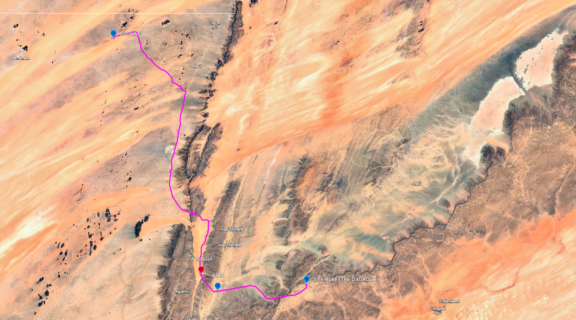 Notre trace depuis un dernier bivouac sur la piste du train jusqu’au site de peintures rupestres d’Agrout, en passant par Azougui et Atar (151 kilomètres).